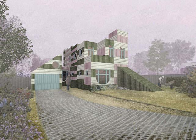 The soft chess-pattern is painted over a boxy hat that is bluntly placed on top of the existing building.