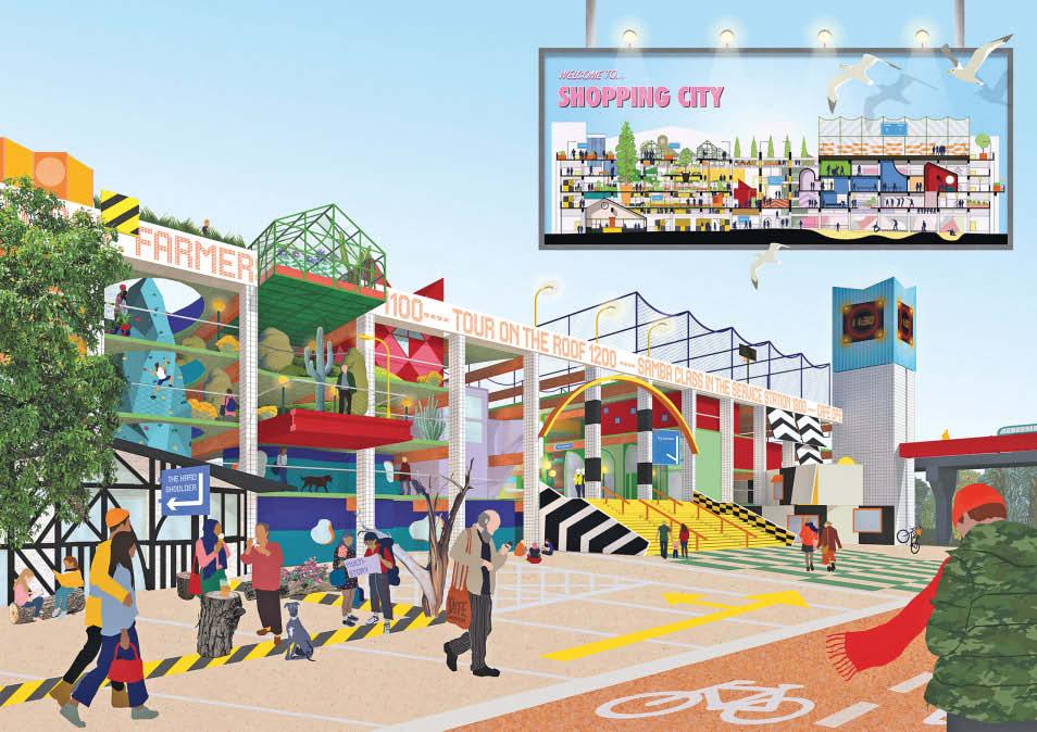 Multi-Story proposes turning the barrier-like car park of Runcorn Shopping Centre (1972) into an outward-facing entrance point for pedestrians, while reintroducing to the retail-heavy ‘town centre’ a mix of much-needed social functions: markets, food and drink, sports pitches, music practice rooms, craft rooms, table tennis and climbing walls.