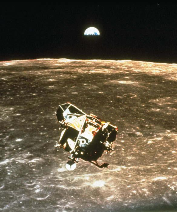 Apollo 11 Lunar Module flying over the moon with the Earth in the background, 1969