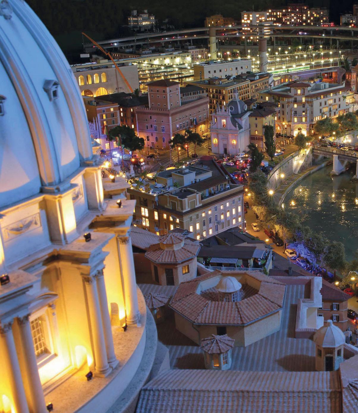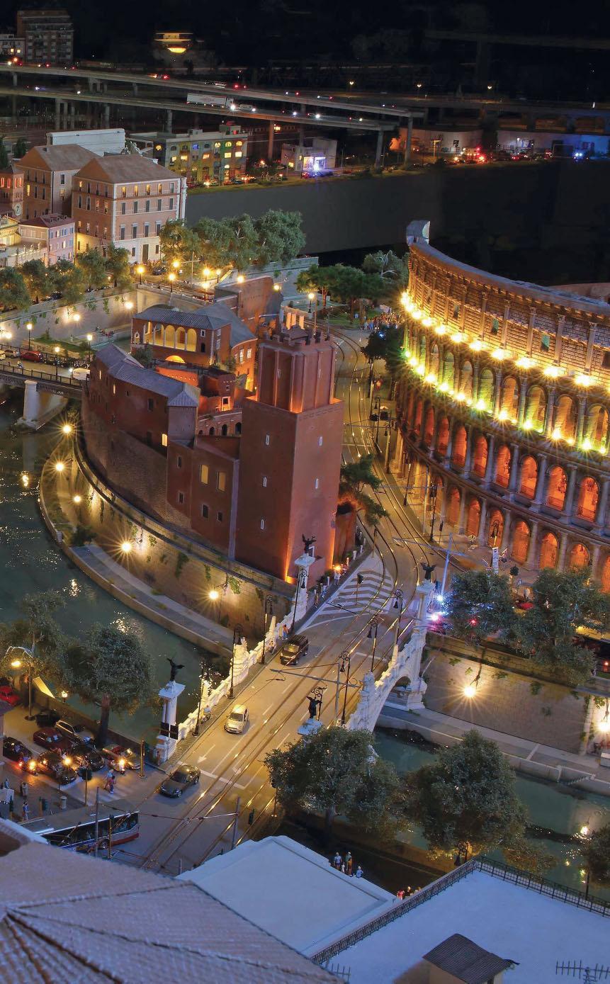 The Italian section of Miniatur Wunderland, as seen at night, requiring thousands of miniature light bulbs to be integrated into the models and automated by computer. Using lighting to simulate a diurnal cycle adds to the realism of the model as well, and gives viewers a God’s-eye view not only spatially but temporally.