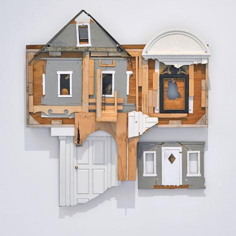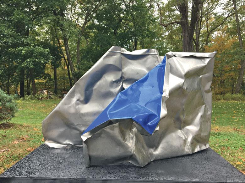 The play between representation and objecthood has been of explicit interest in painting and sculpture. Following the directions indicated by Picasso’s guitar, which translated Cubist syntax into actual space, a number of works have situated themselves at the bounds of pictorialism and objecthood, locating the concerns of art at a crossroads of painting, sculpture and architecture. This painted stainless-steel piece occupies a similar niche.