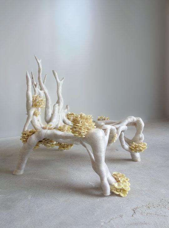 3D-print of living mycelium. Mycelium is the collective product of vegetative (asexual) growth of fungi. It consists of a mass of branching, threadlike hyphae that grow at their tips and respond to environmental stimuli in an exploratory and irregular process. The structure of Klarenbeek & Dros’s chair is formed by 3D-printing of the living material, and evokes branching patterns of growth. Actual growth is part of this process as well, as mushrooms will grow out of the mass of mycelium.