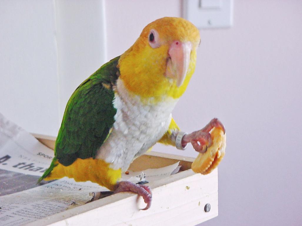 FIGURE 1-2: Parrots have some funny behaviors, like this caique eating a big cookie with one foot.
