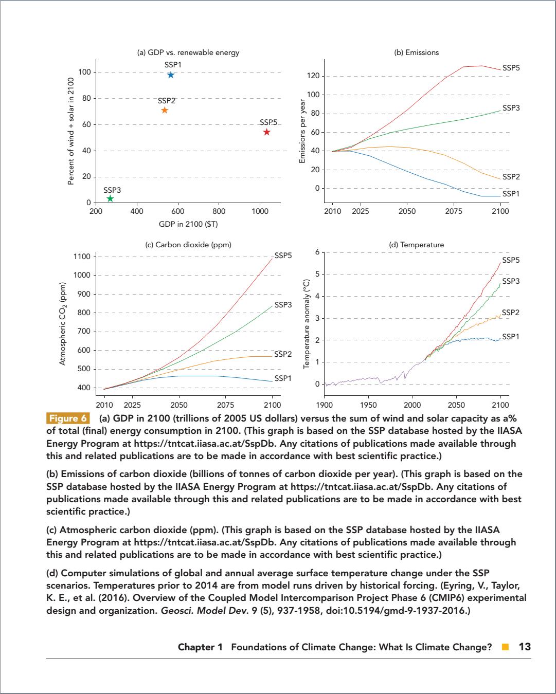 Figure 6c shows that, while the warming of the next few decades is largely already determined by past investments in fossil-fuel infrastructure and inertia in the climate system, we control the amount of warming experienced during the second half of the twenty-first century, and there is nearly a 4°C difference in temperature between the lowest (SSP1) and highest scenario (SSP5). Because many people alive today might live well into the second half of the century, this has relevance for many people who are alive today, and all future generations.