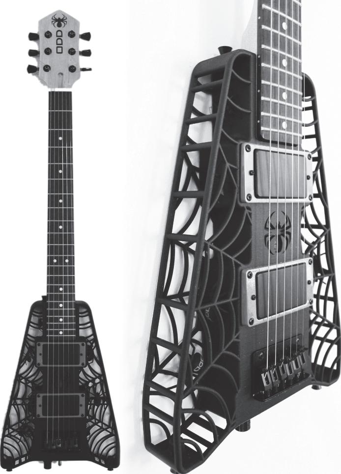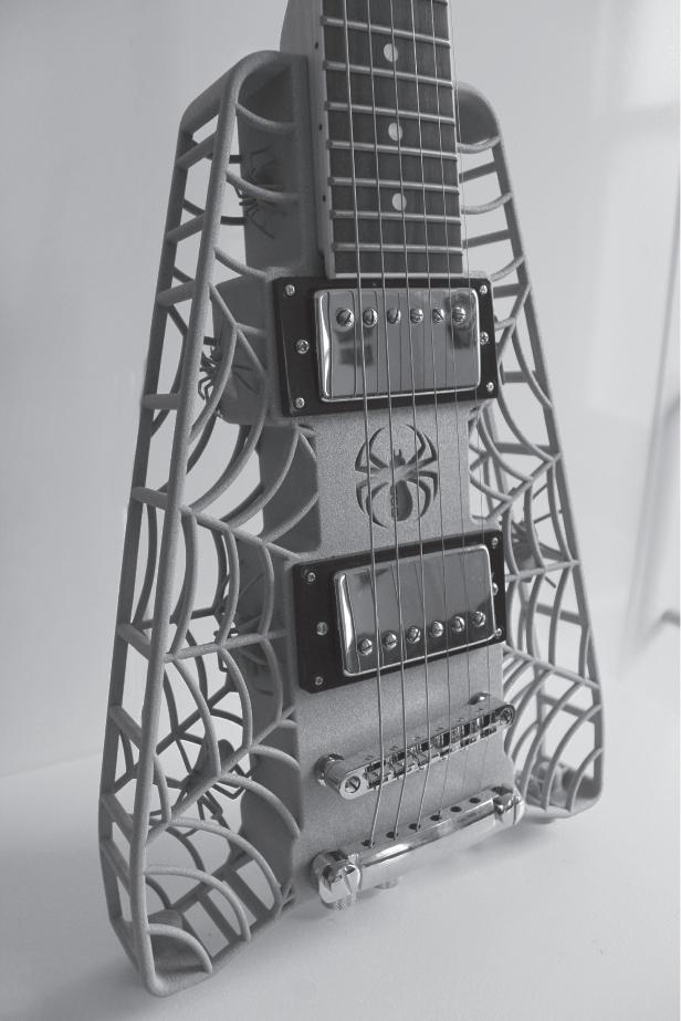 CASESTUDY1.1 Three-DimensionalPrintingofGuitars ThedesignflexibilityofadditivemanufacturingisillustratedbythecustomguitarsproducedbyODD, Inc.TheseguitarsaredesignedinCADprograms,withfullartisticfreedomtopursueinnovative designs;thoseinFigure1.4areonlyaselectionofthemanyavailable.TheCADfileisthensent toathree-dimensionalprinter,usingtheselectivelasersinteringprocessandproducedfromnylon (DuraformPA).Asprinted,theguitarsarewhite.Theyarefirstdyedtoanewbasecolor,then subsequentlyhand-paintedandsprayedwithaclearsatinlacquer.Thecustomer-specifiedhardware (pickups,bridges,necks,tuningheads,etc.)arethenmountedtoproducetheelectricguitar.