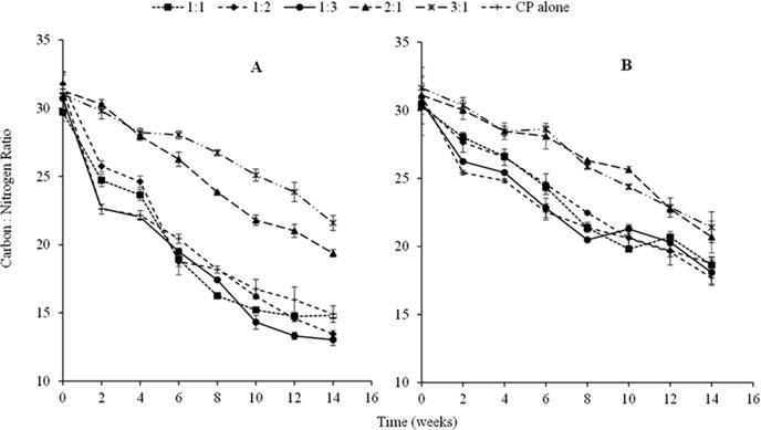Fig.1.7 ChangesinC:Nratioovertimeduringcompostingof flyashincorporatedintocowdungwastepapermixtures(a)withearthwormpresence;(b)withoutearthworms.Errorbarsrepresent standarddeviation.[Source:MupambwaandMnkeni(2015)]