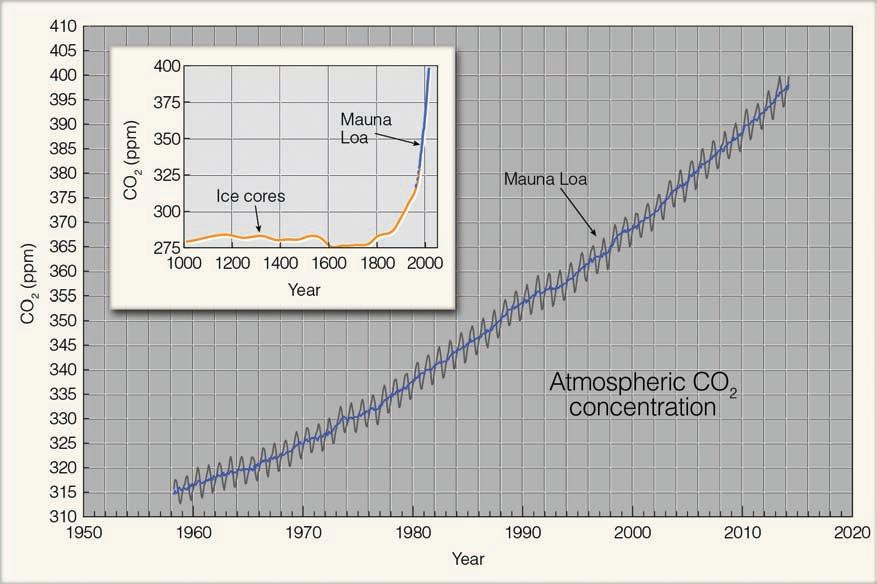 FIGURE 1.6 (a) The solid blue line shows the average yearly measurements of CO2 in parts per million (ppm) at Mauna Loa Observatory, Hawaii, from 1958 to 2013. The jagged dark line illustrates how higher readings occur in winter where plants die and release CO2 to the atmosphere, and how lower readings occur in summer when more abundant vegetation absorbs CO2 from the atmosphere. (b) The insert shows CO2 values in ppm during the past 1000 years from ice cores in Antarctica (orange line) and from Mauna Loa Observatory (blue line). (Mauna Loa data courtesy of NOAA; Ice Core data courtesy of Carbon Dioxide Information Analysis Center, Oak Ridge National Laboratory)