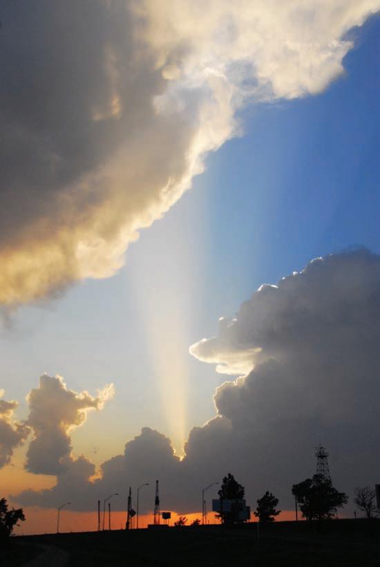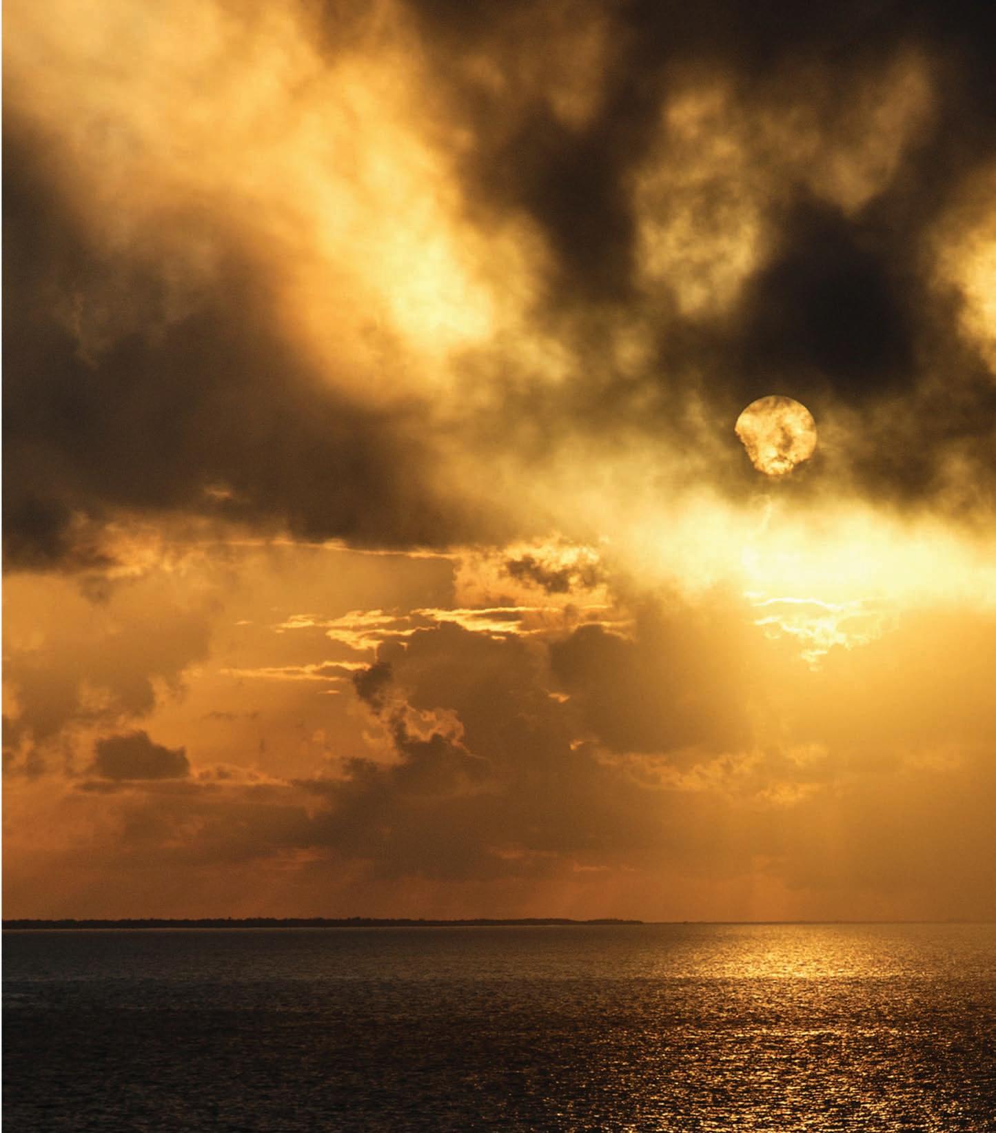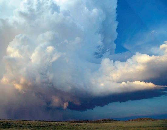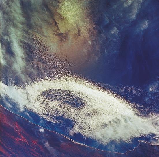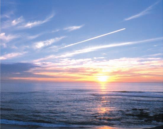 FIGURE 1.4 Earth’s atmosphere is a rich mixture of many gases, with clouds of condensed water vapor and ice crystals. Here, water evaporates from the ocean’s surface. Rising air currents then transform the invisible water vapor into many billions of tiny liquid droplets that appear as puffy cumulus clouds. If the rising air in the cloud should extend to greater heights, where air temperatures are quite low, some of the liquid droplets would freeze into minute ice crystals.