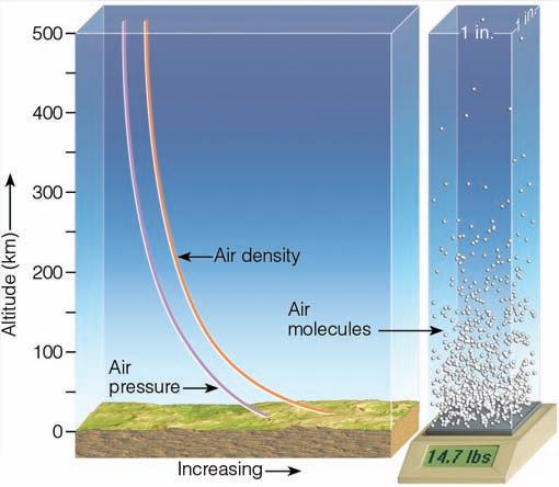 FIGURE 1.9 Both air pressure and air density decrease with increasing altitude. The weight of all the air molecules above Earth’s