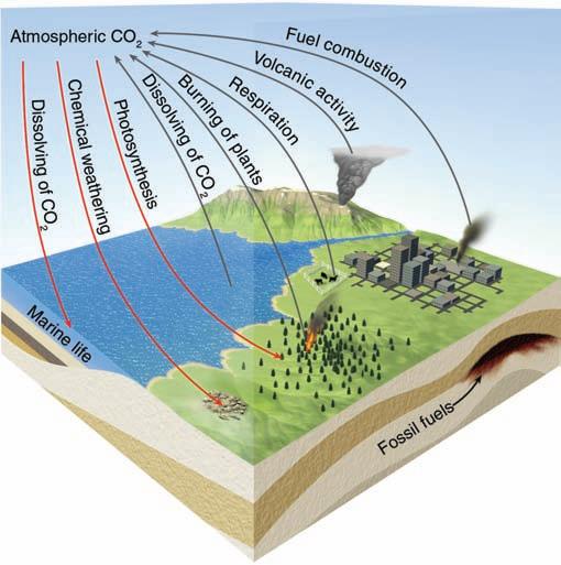 1.5 The main components of the atmospheric carbon dioxide cycle. The gray lines show processes that put carbon dioxide into the atmosphere, whereas the red lines show processes that remove carbon dioxide from the atmosphere.