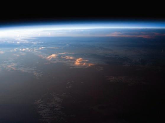Earth’s atmosphere as viewed from space. The atmosphere is the thin bluish-white region along the edge of Earth. The photo was taken from the International Space Station on April 12, 2011, over western South America.