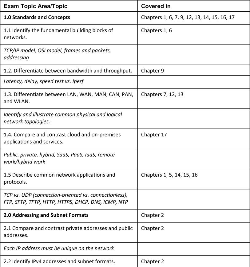 The Cisco Certified Support Technician (CCST) Networking exam is broken down into six major topic areas. The contents of this book cover each of the exam topic areas and the topics included in them as outlined in the table that follows.