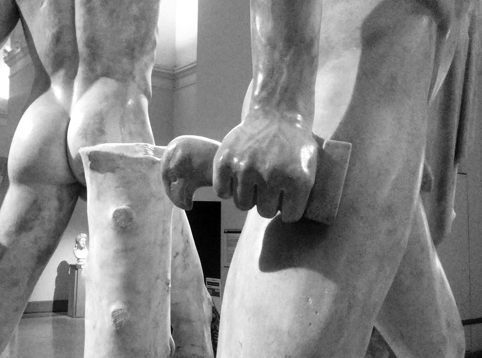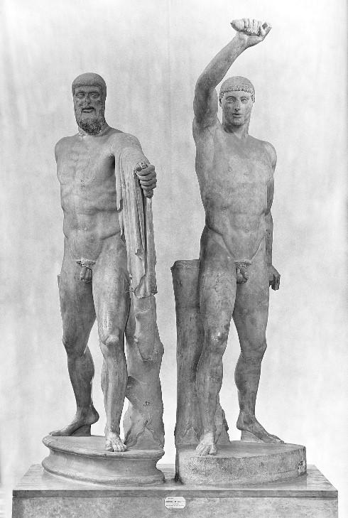 asesinar al dictador Hiparco de Atenas, en el año 514 a. C. Cuatro años más tarde, cuando se instauró la democracia en la ciudad-estado, el heroísmo de los dos jóvenes fue objeto de celebración y se produjeron en masa imágenes para conmemorarlos; su recuerdo se conserva en monedas y en las numerosas copias de la estatua repartidas por todo el mundo mediterráneo. Cuando vi el conjunto escultórico de los dos guerreros en el Museo Arqueológico de Nápoles, la sorpresa me hizo retroceder un par de pasos.