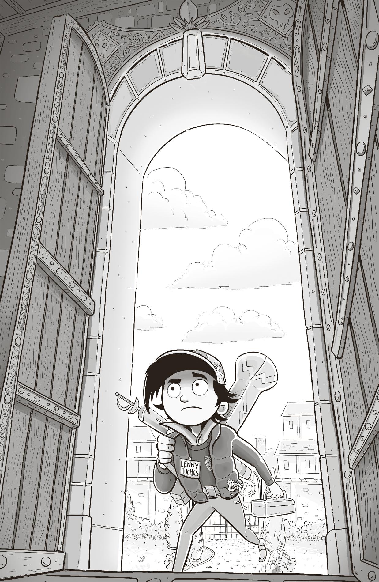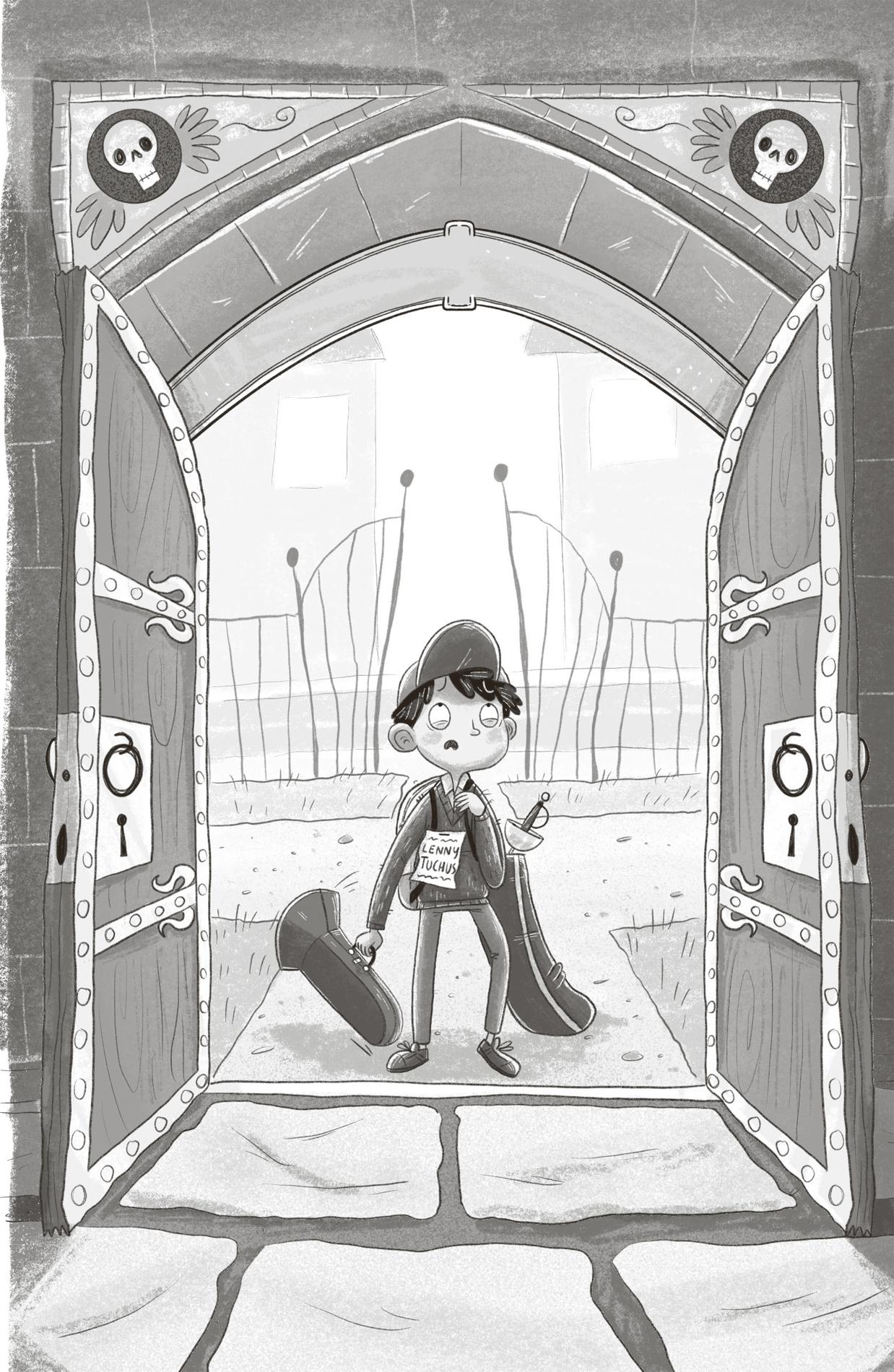 So, collar up, baseball cap on my head at just the right angle, and carrying my favourite trombone and brand-new fencing kit, I said, ‘Yo, gargoyle, you can’t put Lenny Tuchus off with that horrible face of yours,’ and pushed through the set of huge mahogany doors and strutted into the entrance hall of my newest brand-new school.