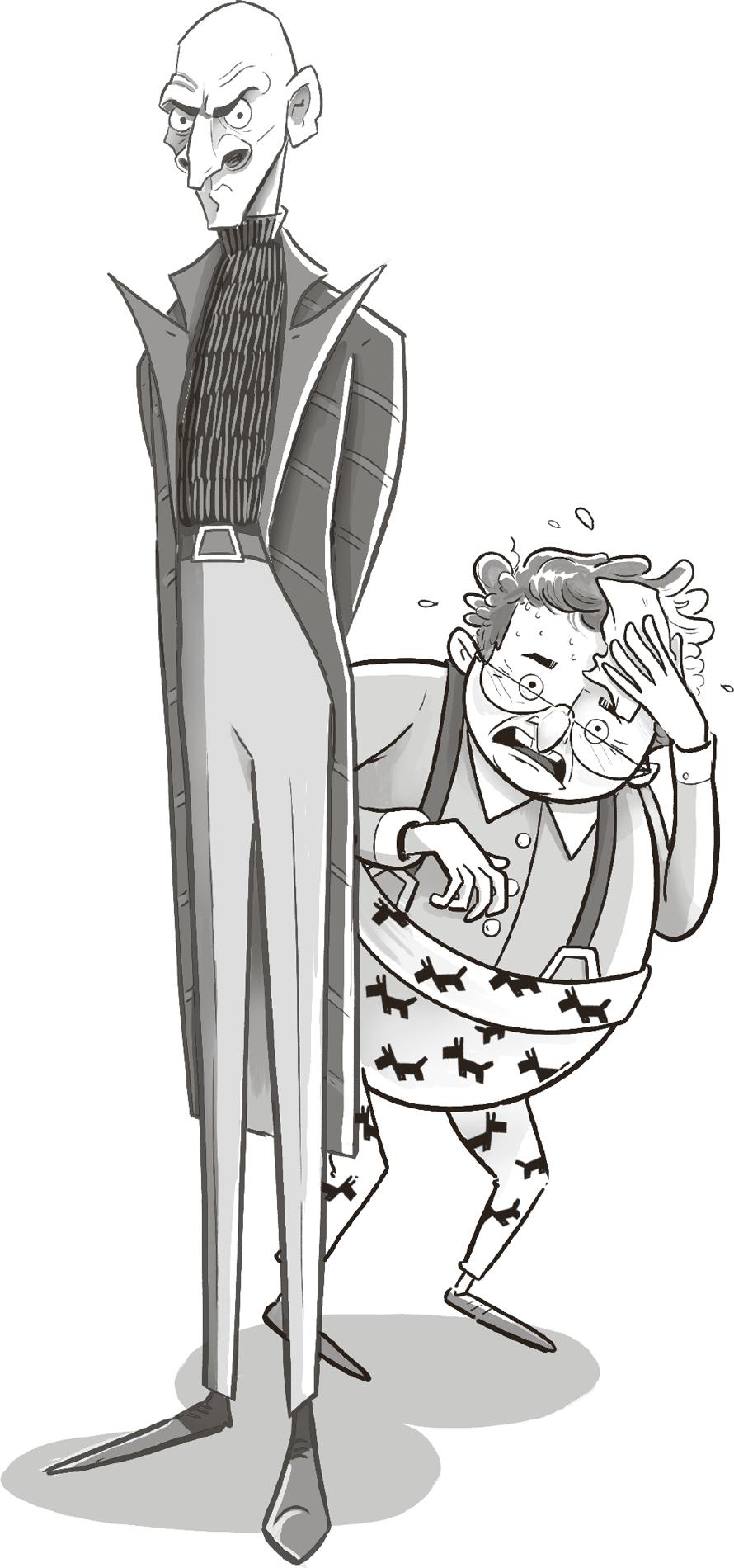 Right at that moment, a small, round man beetled up to the desk. He was wearing half-moon glasses, bright yellow trousers with small Scottie dogs embroidered on them, and red braces that looked like they might snap any second under the strain of his tummy.
