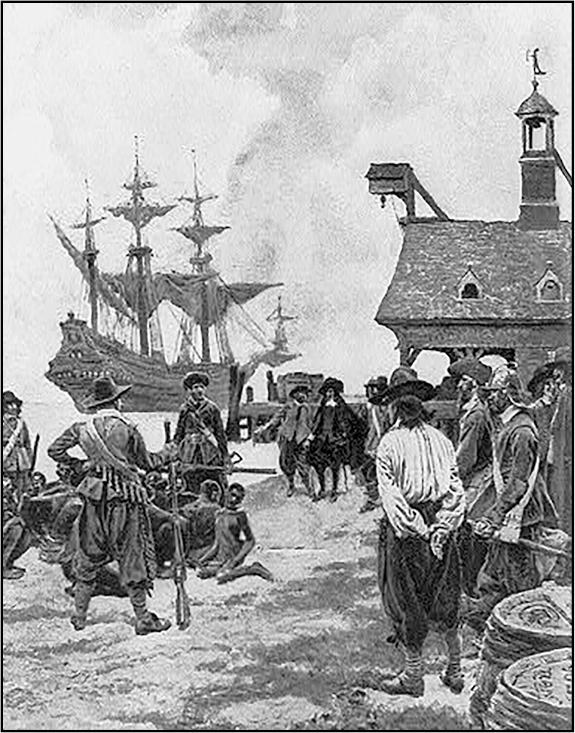 A 1901 illustration of Africans from a Dutch ship landing at Jamestown in 1619.