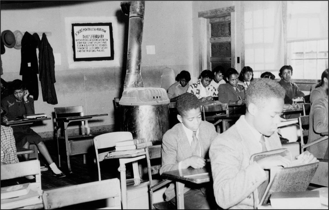 Students in an English class at R. R. Moton High School, c. 1951. The stove that heated the “temporary” classroom often sent cinders flying.