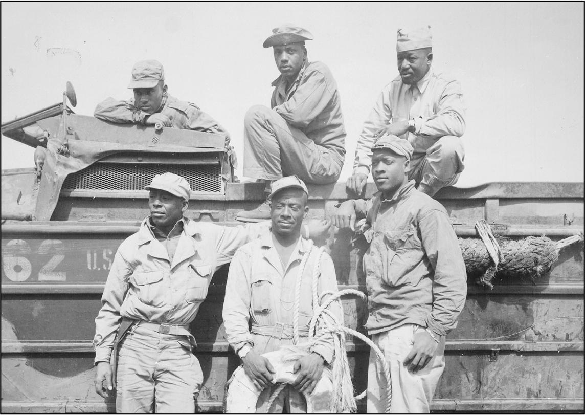 Six Black soldiers who almost died trying to rescue a drowning marine in the surf at Iwo Jima. From left to right, back row: Technician L. C. Carter, Jr., Private John Bonner, Jr.; Staff Sergeant Charles R. Johnson. Front row, from left to right: Technician A. B. Randle, Technician Homer H. Gaines, and Private Willie Tellie. March 11, 1945.
