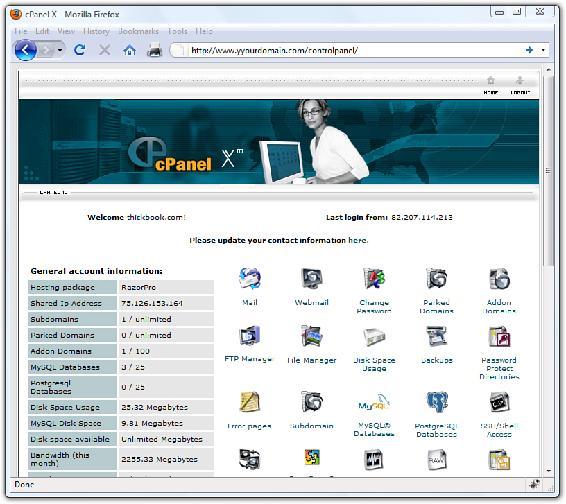 One feature of a good hosting provider is that it provides a “control panel” for you to manage aspects of your account. Figure 1.3 shows the control panel for my own hosting account at Daily Razor. Many web hosting providers offer this particular control panel software, or some control panel that is similar in design—clearly labeled icons leading to tasks you can perform to configure and manage your account.