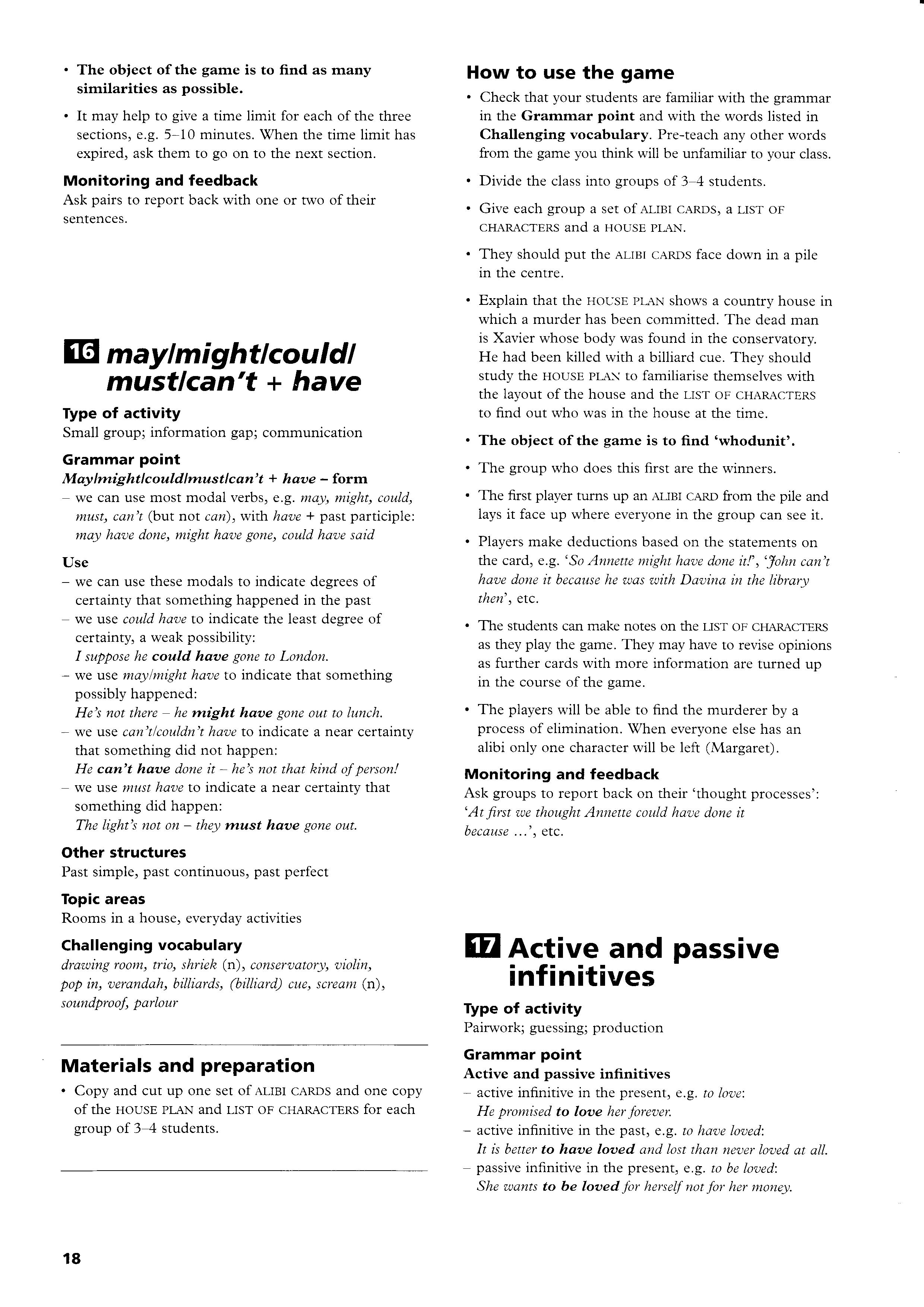 Check that your students are familiar with the grammar in the Grarnrnar point and with the words listed in Challenging vocabulary. Pre-teach any other words from the game you think will be unfamiliar to your class.