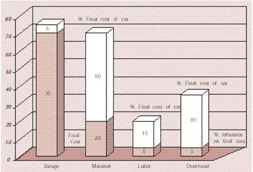 Ford manufactures a broad range of cars and trucks targeted at various consumer segments. A study done at Stanford University reveals how knowledge utilized in the conceptual design stage of a typical Ford car drives between 70 to 90 percent of its final life-cycle cost.[5] Even though design accounts for only 5 percent of the final cost of a typical car, it influences 70 percent or more of the vehicle's final cost. Similarly, material (as shown in Figure 2-1) constitutes 50 percent of the final cost of a typical car, but its influence on the final cost is only about 20 percent.