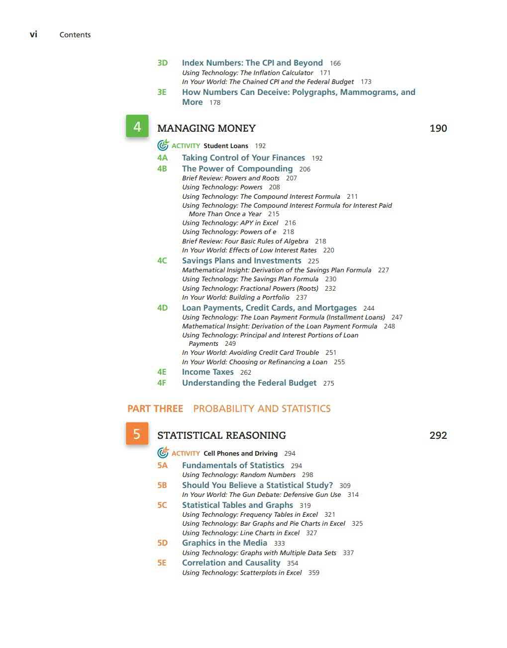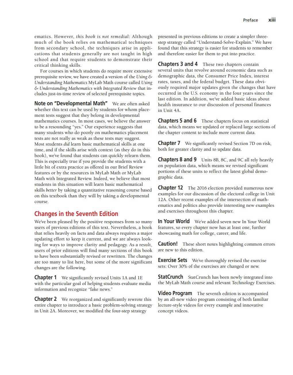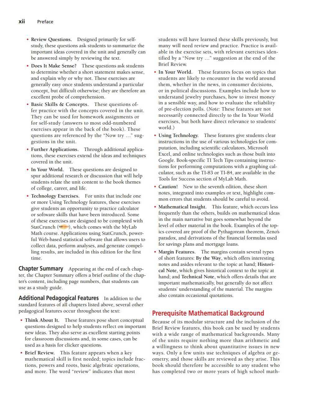 We all use math i n our day-to-day lives. The goa l o f t his book is to imp rove students' mathematical lite racy so that t hey can use math mo re effective ly in everyday li f e. Mathematics can hel p students bette r u nde rsta nd a va riety of top ics and issues, making t hem mor e awa re of t he uses and abuses of numbe rs. The u lt imate goa l is to help t hem become bette r educated cit ize ns who are successfu l in t heir co llege experiences, the ir careers, and the ir lives.
