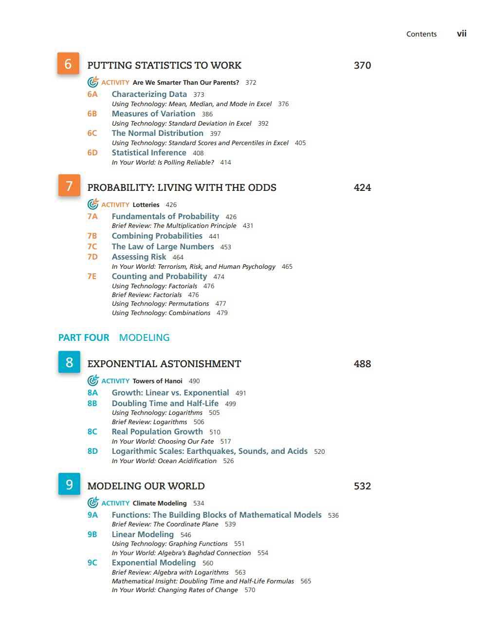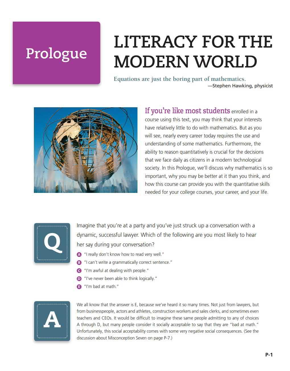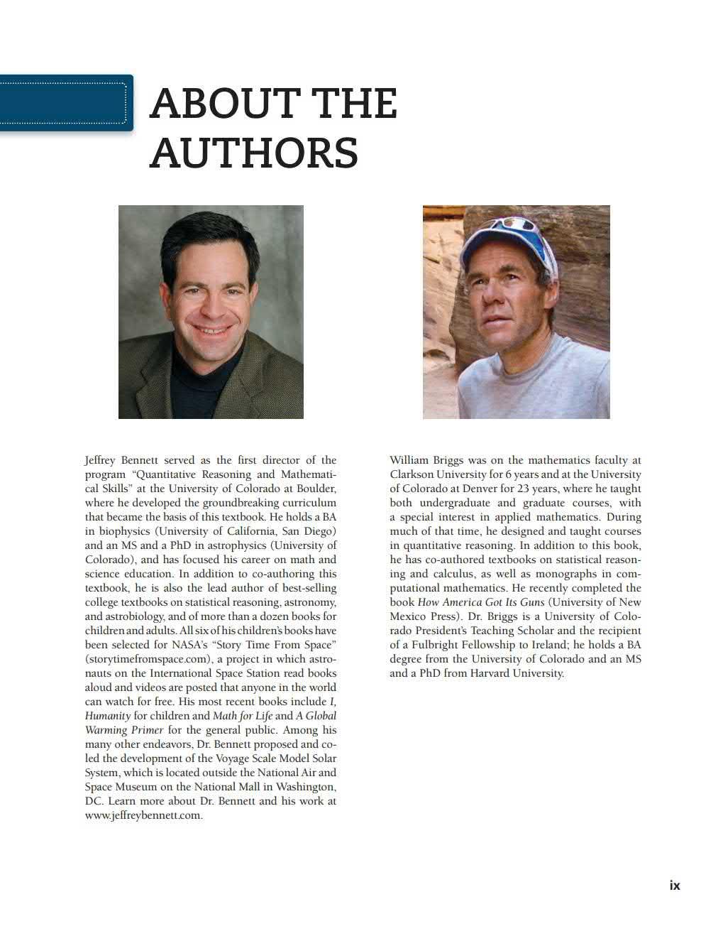 We all use math i n our day-to-day lives. The goa l o f t his book is to imp rove students' mathematical lite racy so that t hey can use math mo re effective ly in everyday li f e. Mathematics can hel p students bette r u nde rsta nd a va riety of top ics and issues, making t hem mor e awa re of t he uses and abuses of numbe rs. The u lt imate goa l is to help t hem become bette r educated cit ize ns who are successfu l in t heir co llege experiences, the ir careers, and the ir lives.