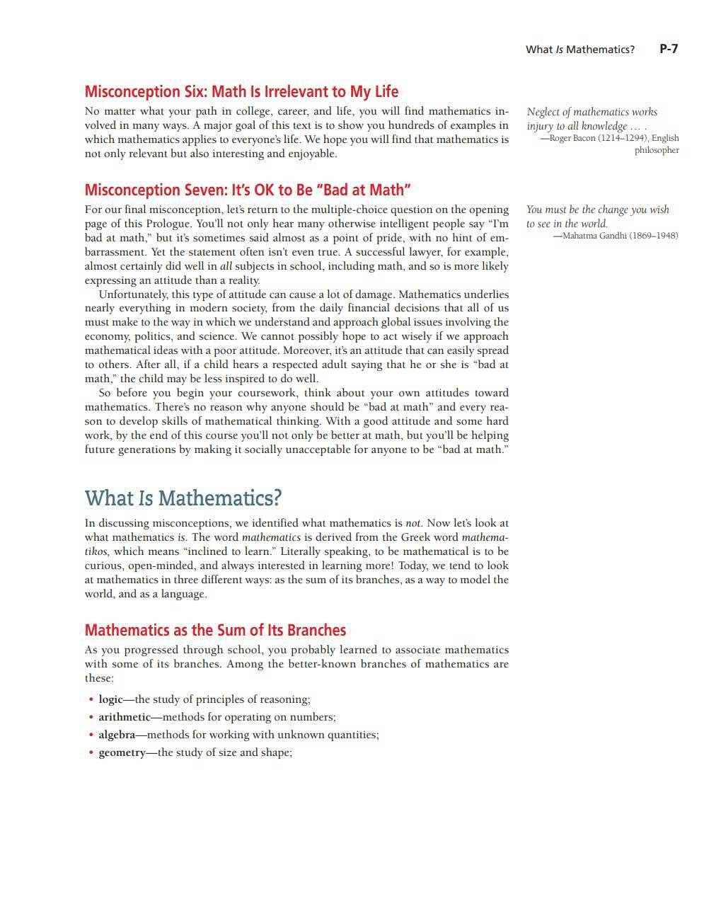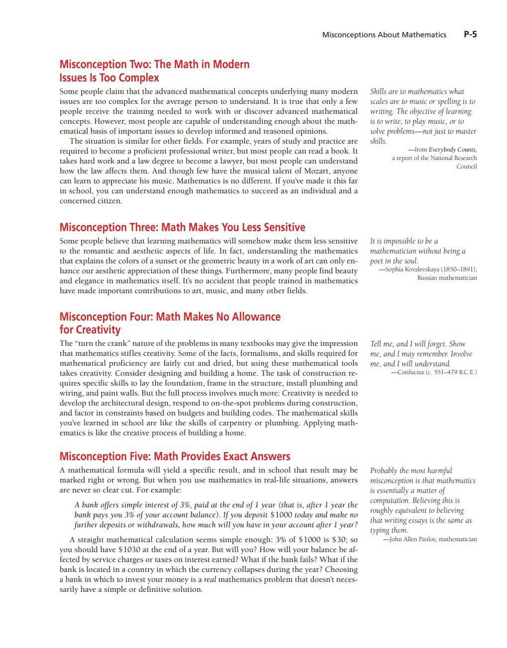 In reality, mathematics is not nea rly so dry as it sometimes seems in school. Indeed, attitudes toward mathematics often are directed not at what mathematics really is but at some common m isconceptions about mathematics Let's investigate a few of these m isconceptions and the reality behind them
