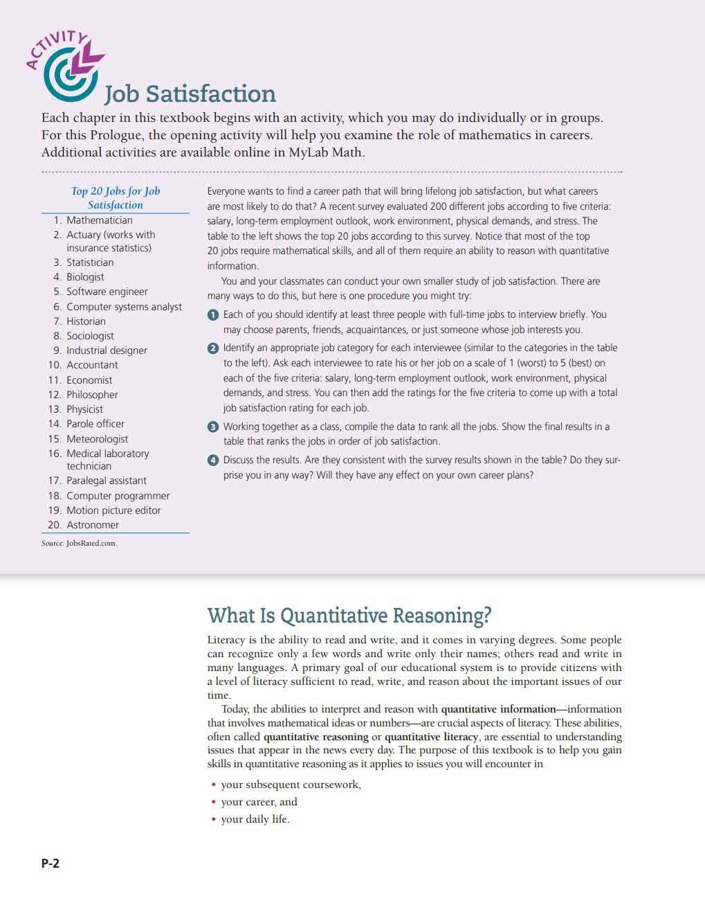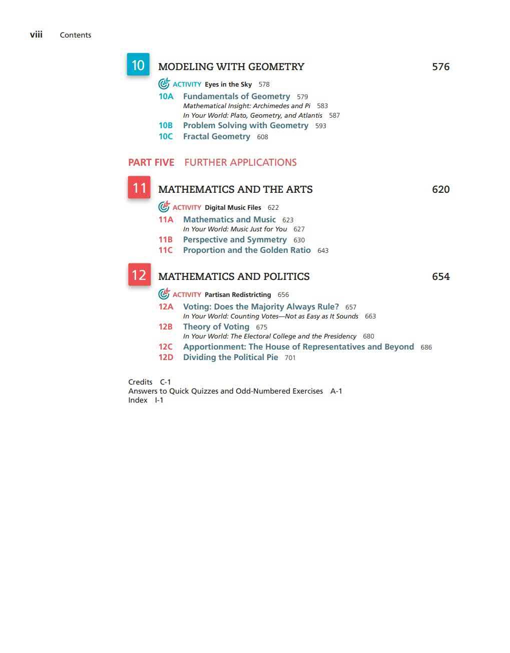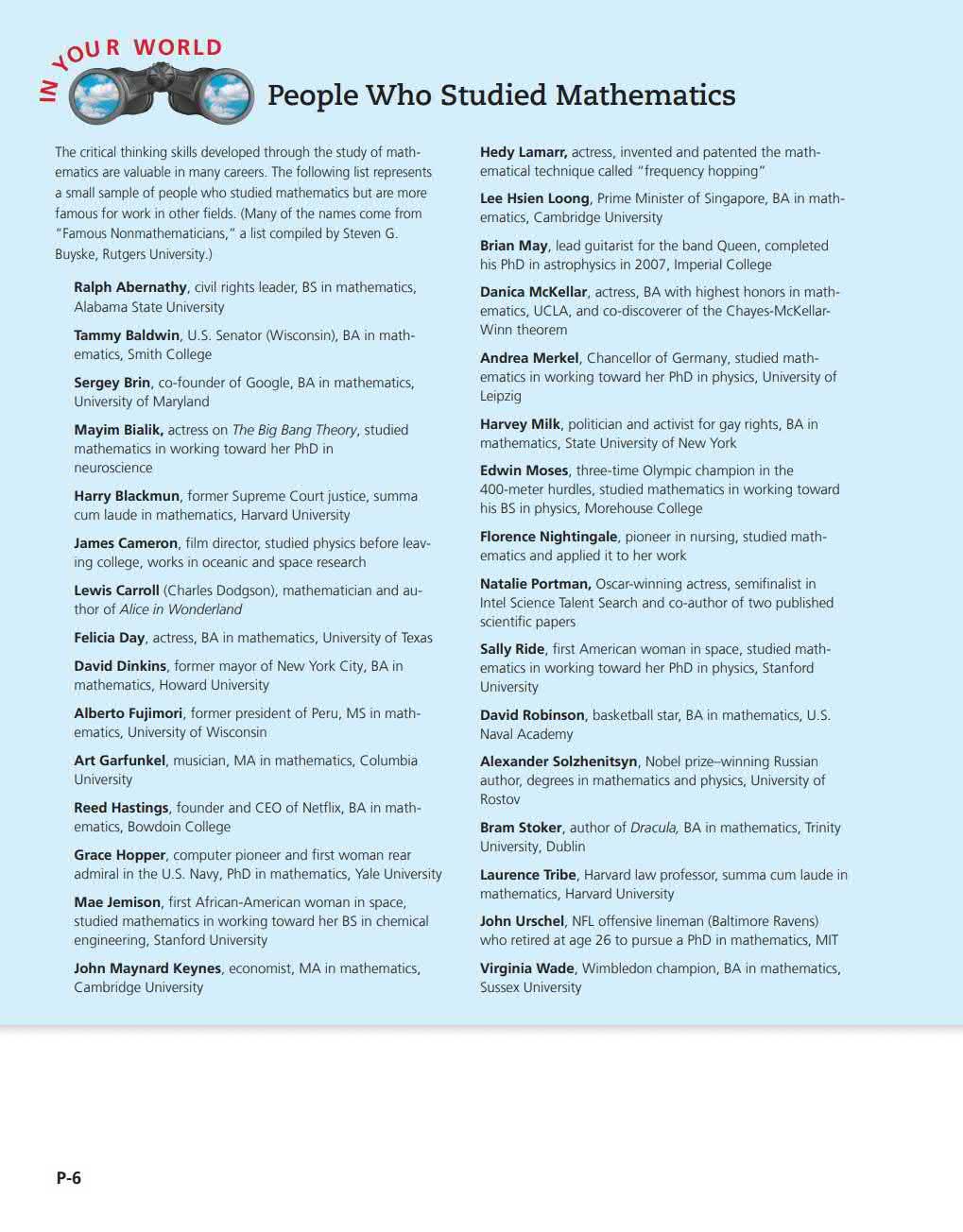No matter what your path i n college, ca reer, and life , you will find mathematics involved in many ways. A majo r goal of this text is to show you hund reds of exampl es in wh ich mathematics app li es LO everyone's life We hope you will find that mathematics is not on l y relevant but a lso inte resting and enjoyable.