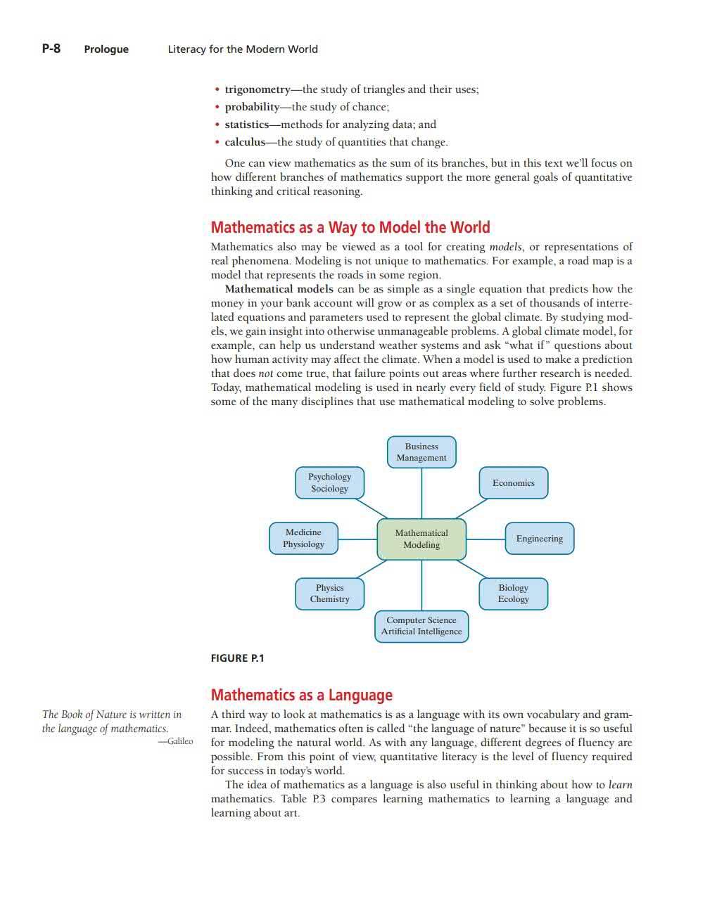 Mathematics also may be v iewed as a tool for creating models, or representations of real phenomena Modeling is not unique to mathematics For examp le , a road map is a mode l that represents the roads in some region . Ma t hema t ica l mode ls can be as s imple as a s i ngle equation that predicts how the money in you r bank account will g row o r as complex as a set of thousands of inter related equations and pa rameters used to rep resent the gl obal climate. By studying models, we gain insight into otherwise unmanageab l e probl ems A global cl imate model, fo r examp l e , can he l p us unde rstand weathe r systems and ask " what i f " questions about how human activity may affect the climate. When a model is used to make a prediction that does not come t r ue , that fa il u re points out areas where further resea rch is needed. Today, mathematical modeling is used in nearl y every field of study. F igu re P. l shows some of the many d isciplines that use mathematical modeling tO solve prob lems .