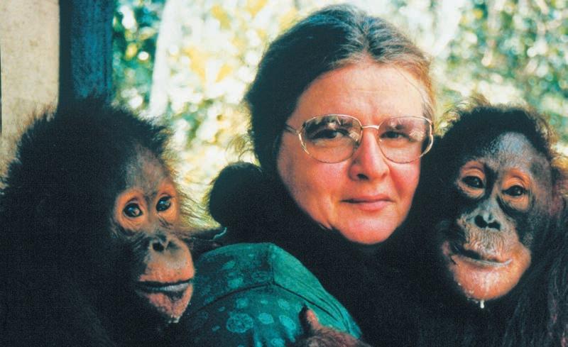 Birute Galdikas works with two orangutans in Borneo.