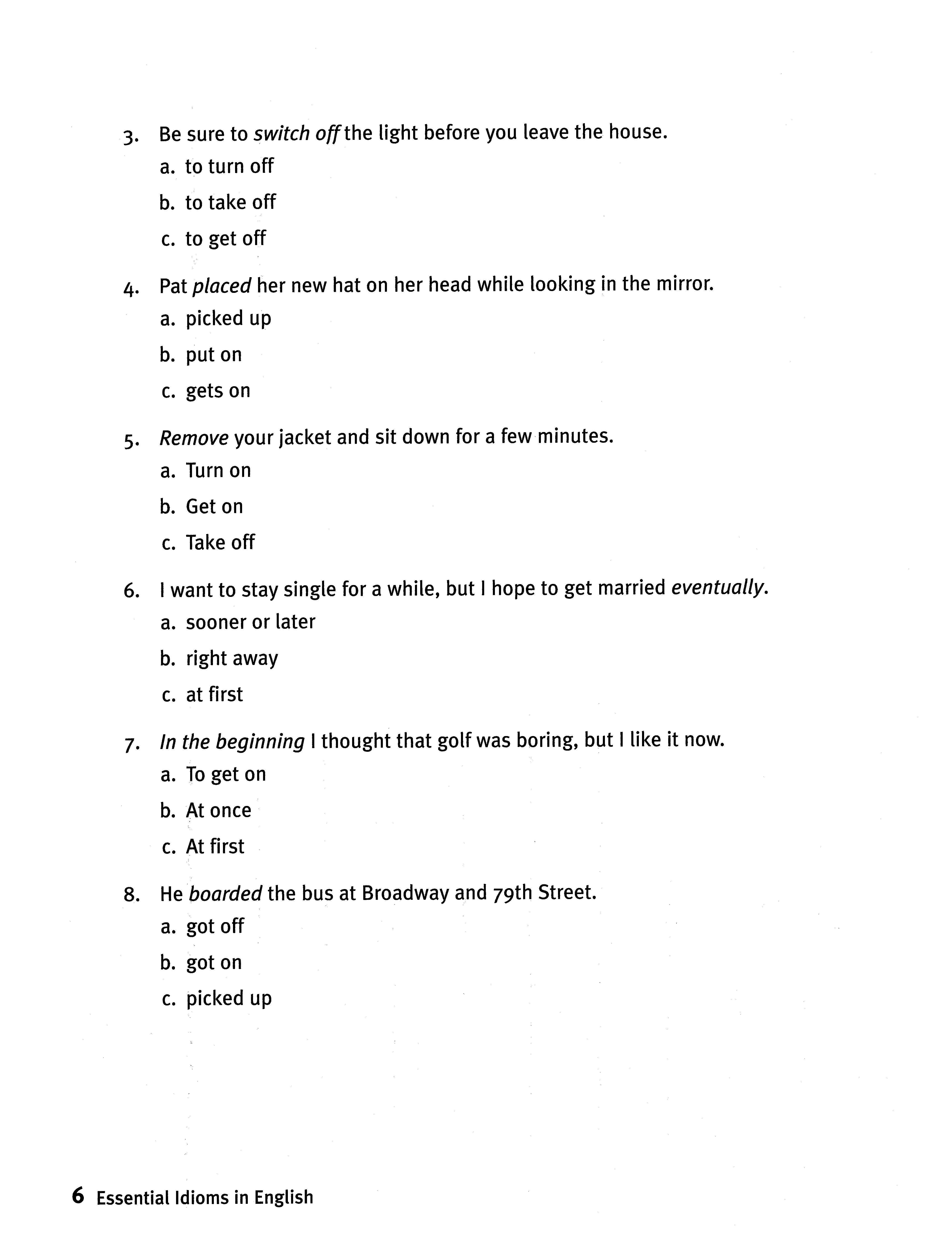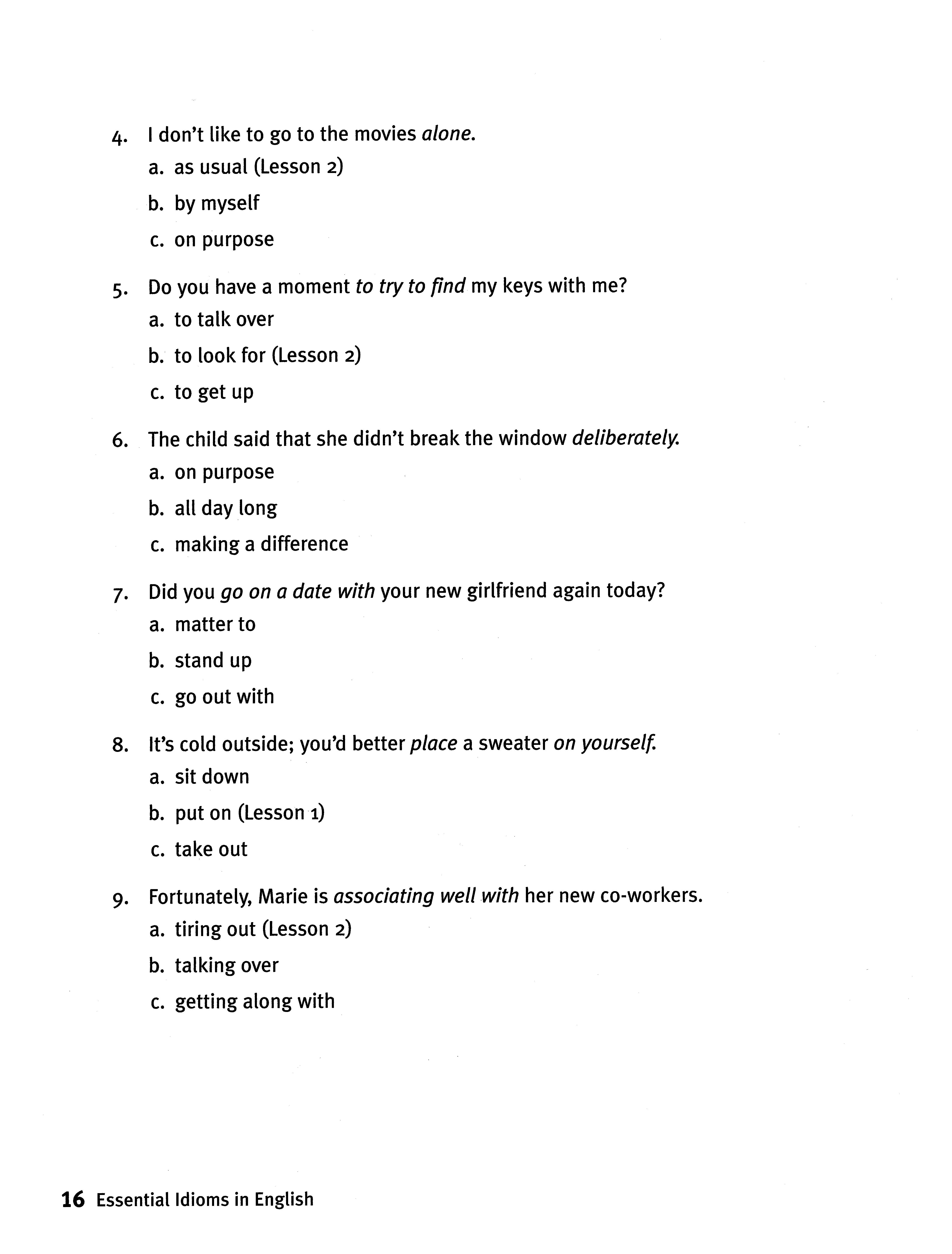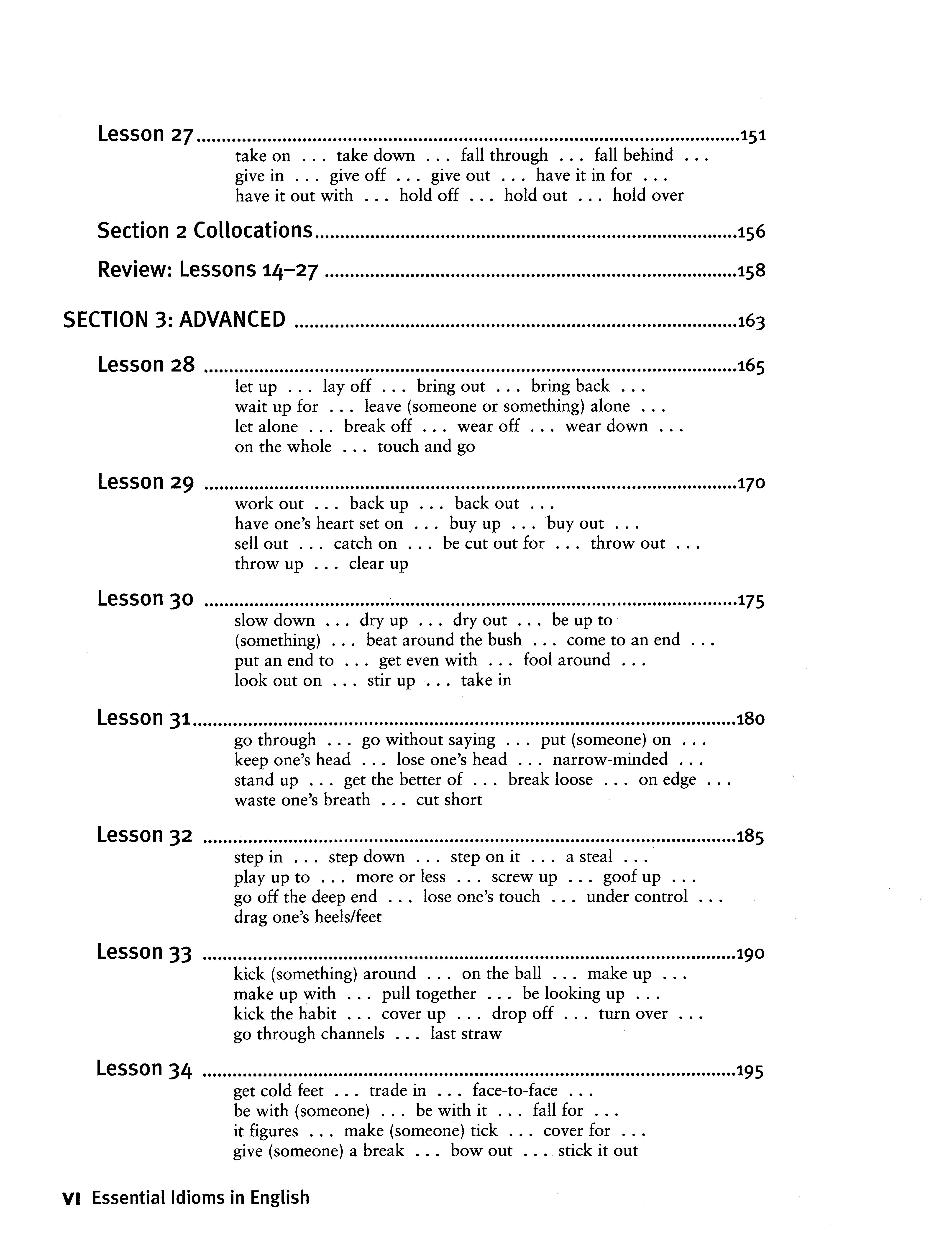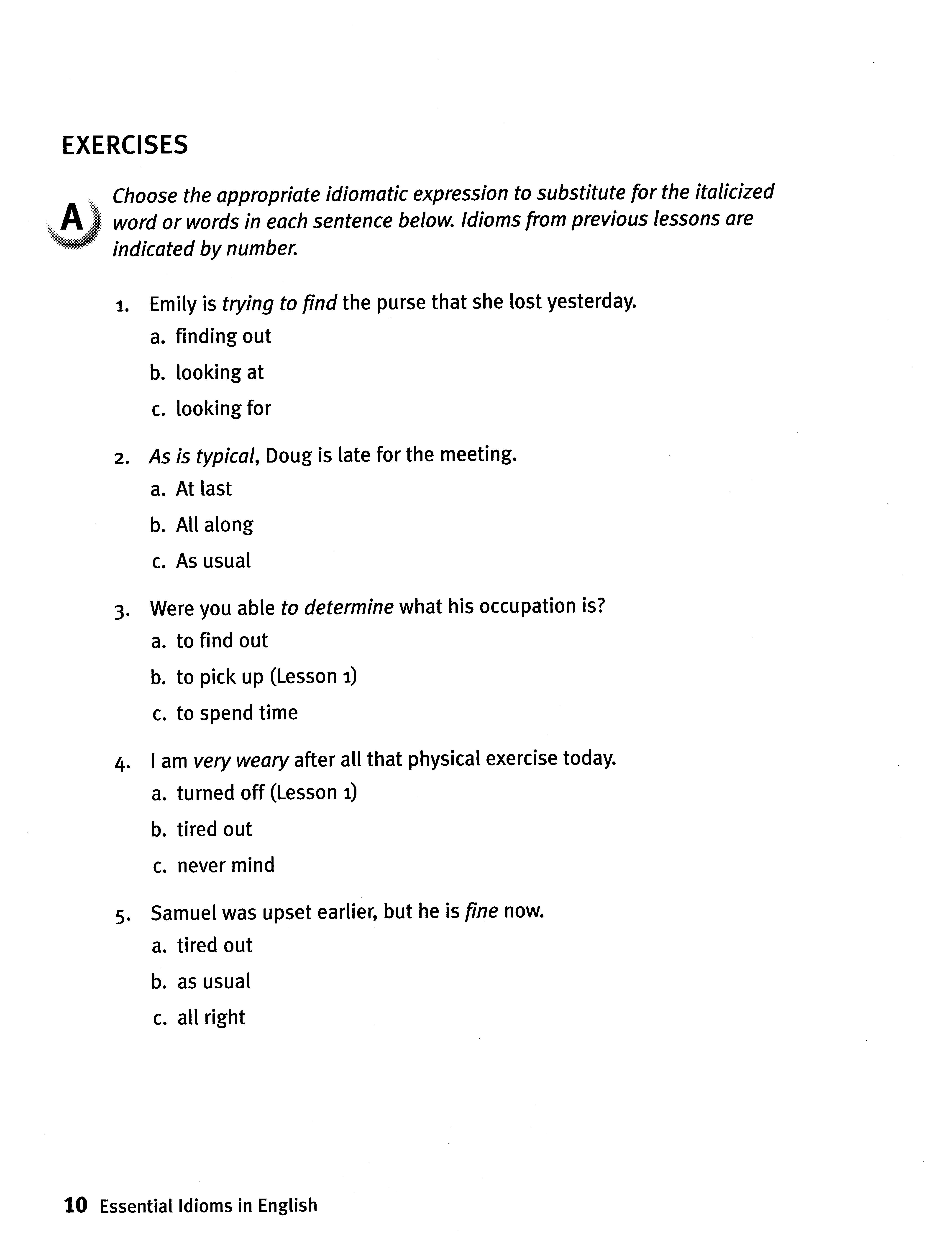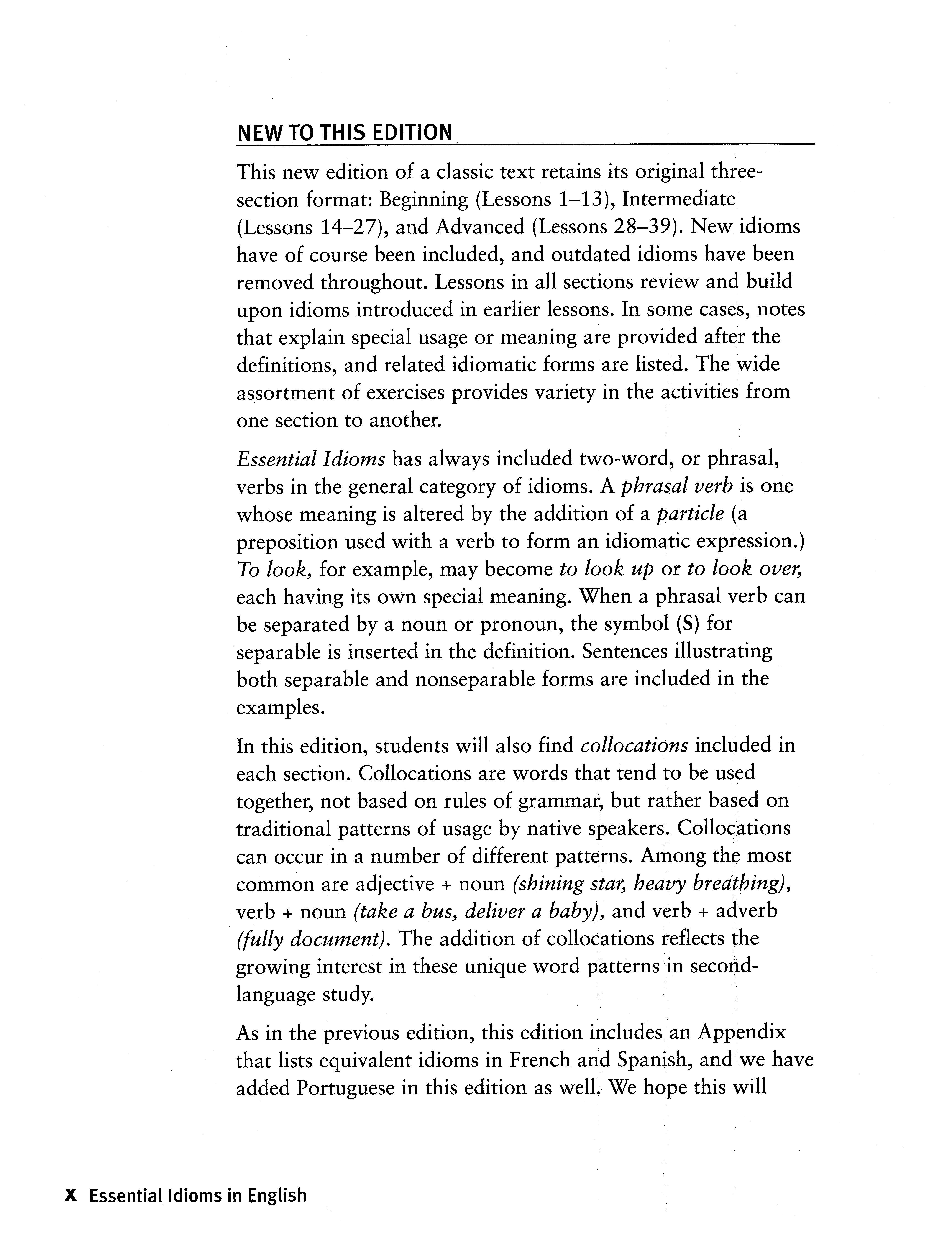 For this reason, the idioms, phrasal verbs, and collocations included in this book have been selected because they are, for the most part, basic to good English-and the book is called, appropriately, Essential Idioms in English. Students are not burdened with a discussion of the origins of idioms, nor is there an attempt to define the exact nature of an idiom except to point out that as a phrase it has a meaning different from the meanings of its individual parts. (This essential characteristic is one reason why it is often difficult to translate an idiom from one language to another without incurring some change in meaning or usage.)