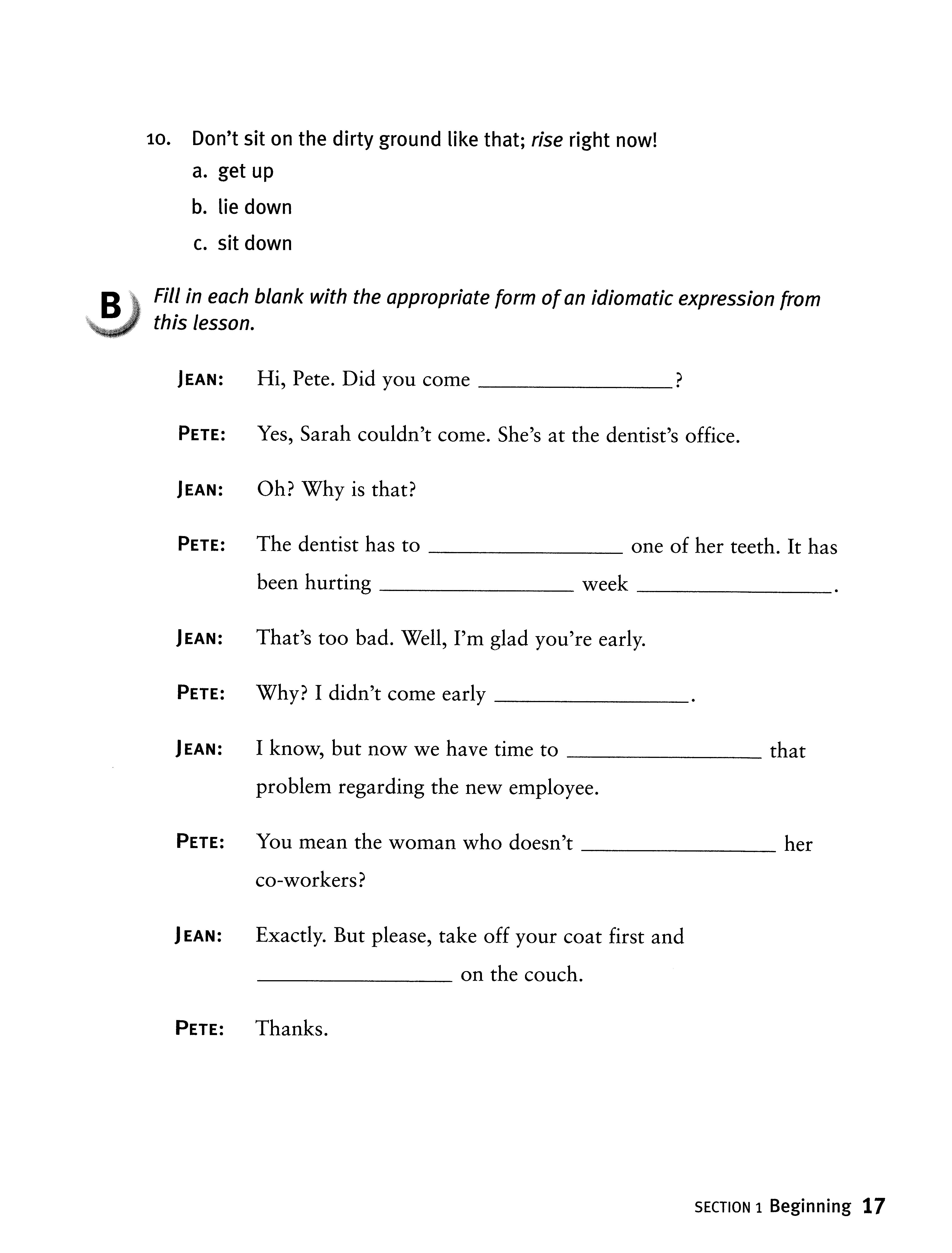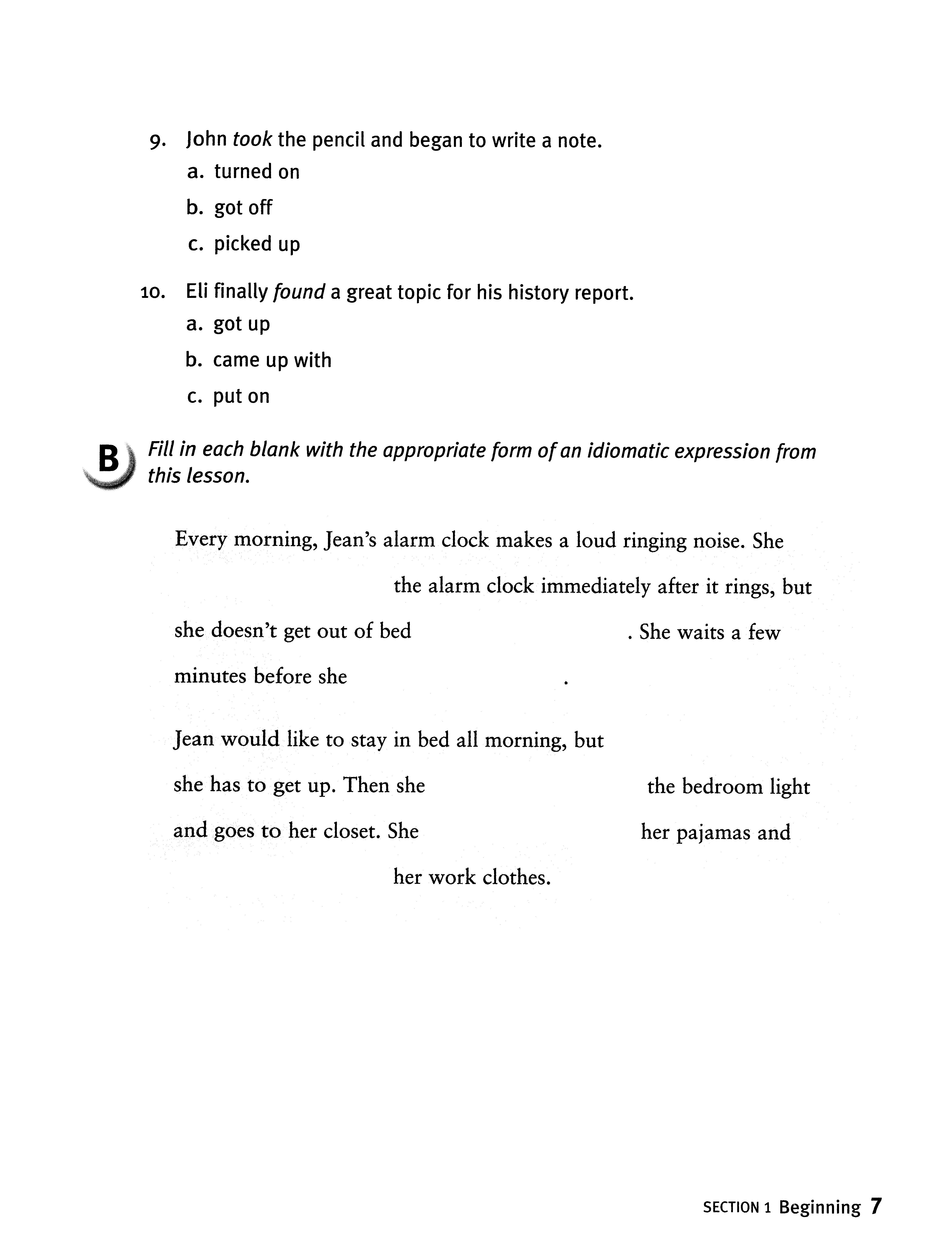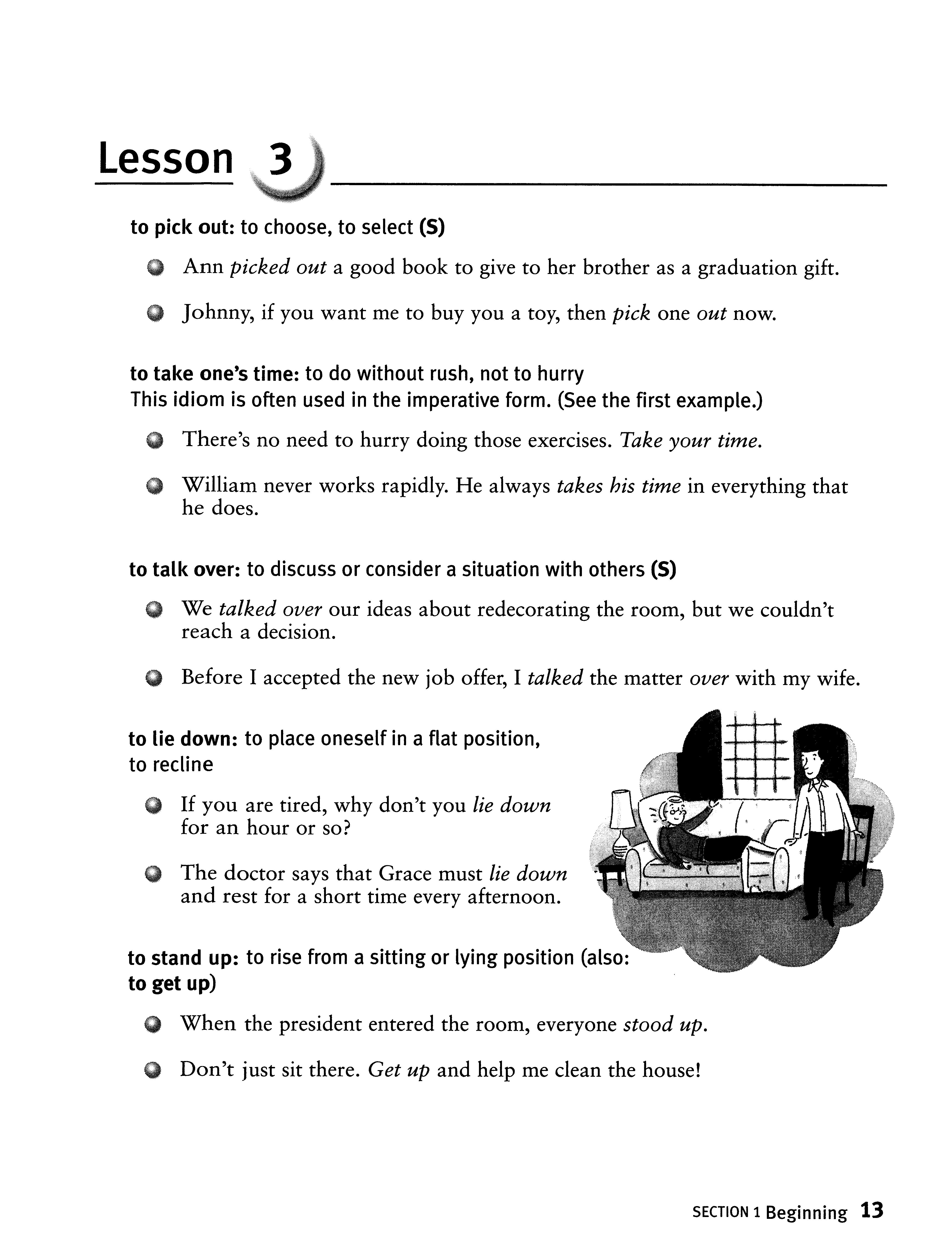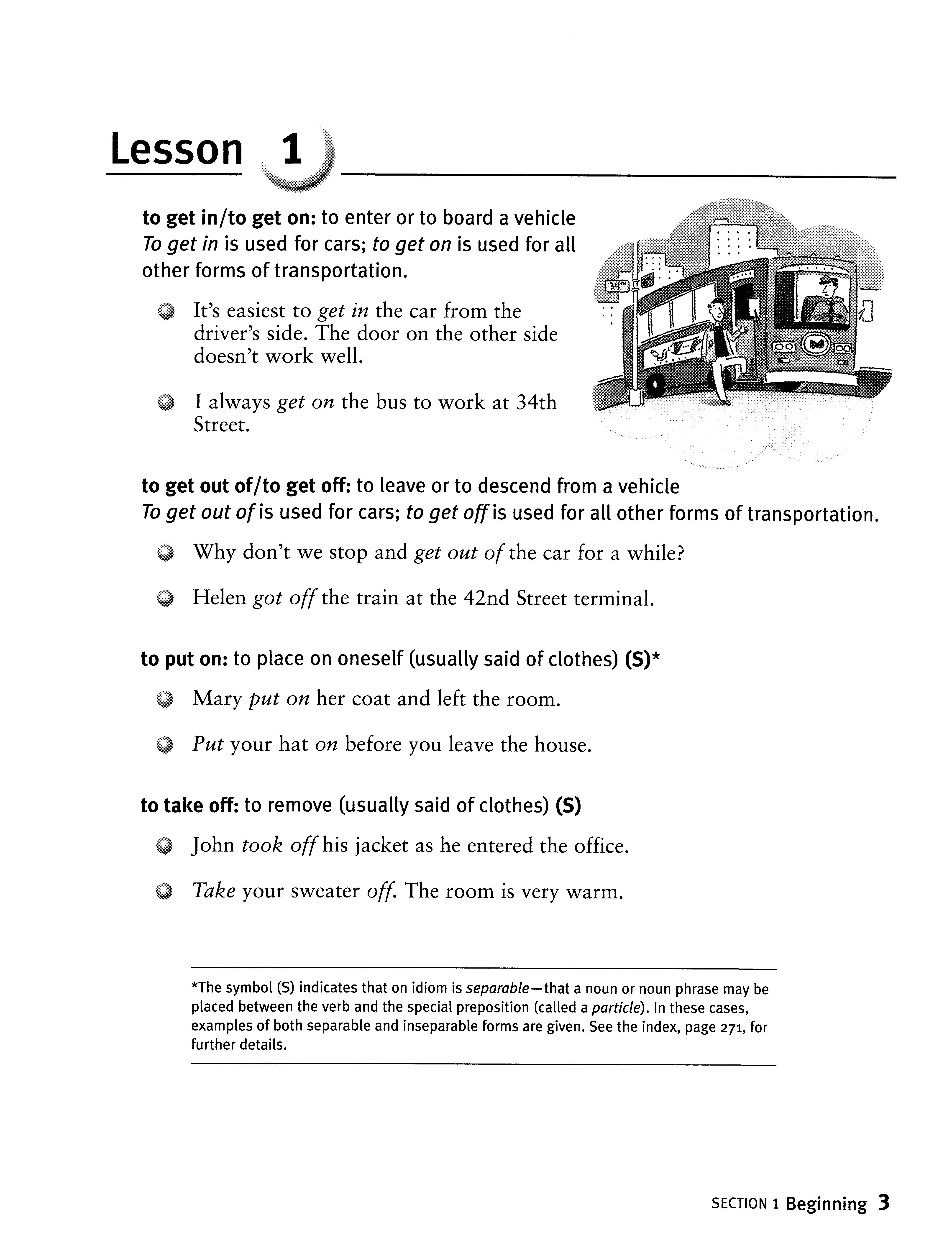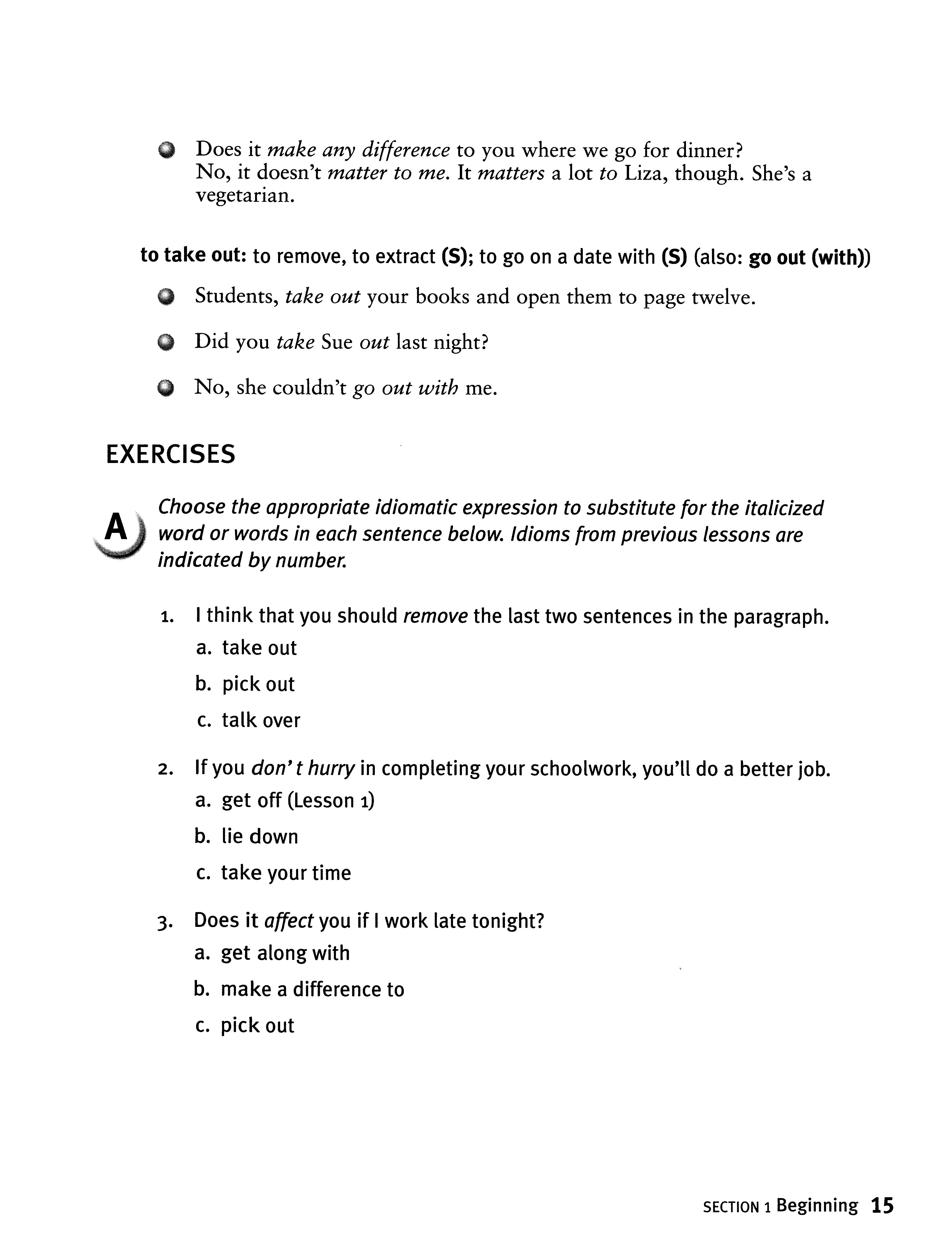 This new edition of a classic text retains its original threesection format: Beginning (Lessons 1-13 ), Intermediate (Lessons 14-27), and Advanced (Lessons 28-39). New idioms have of course been included, and outdated idioms have been removed throughout. Lessons in all sections review and build upon idioms introduced in earlier lessons. In some cases, notes that explain special usage or meaning are provided after the definitions, and related idiomatic forms are listed. The wide assortment of exercises provides variety in the activities from one section to another.