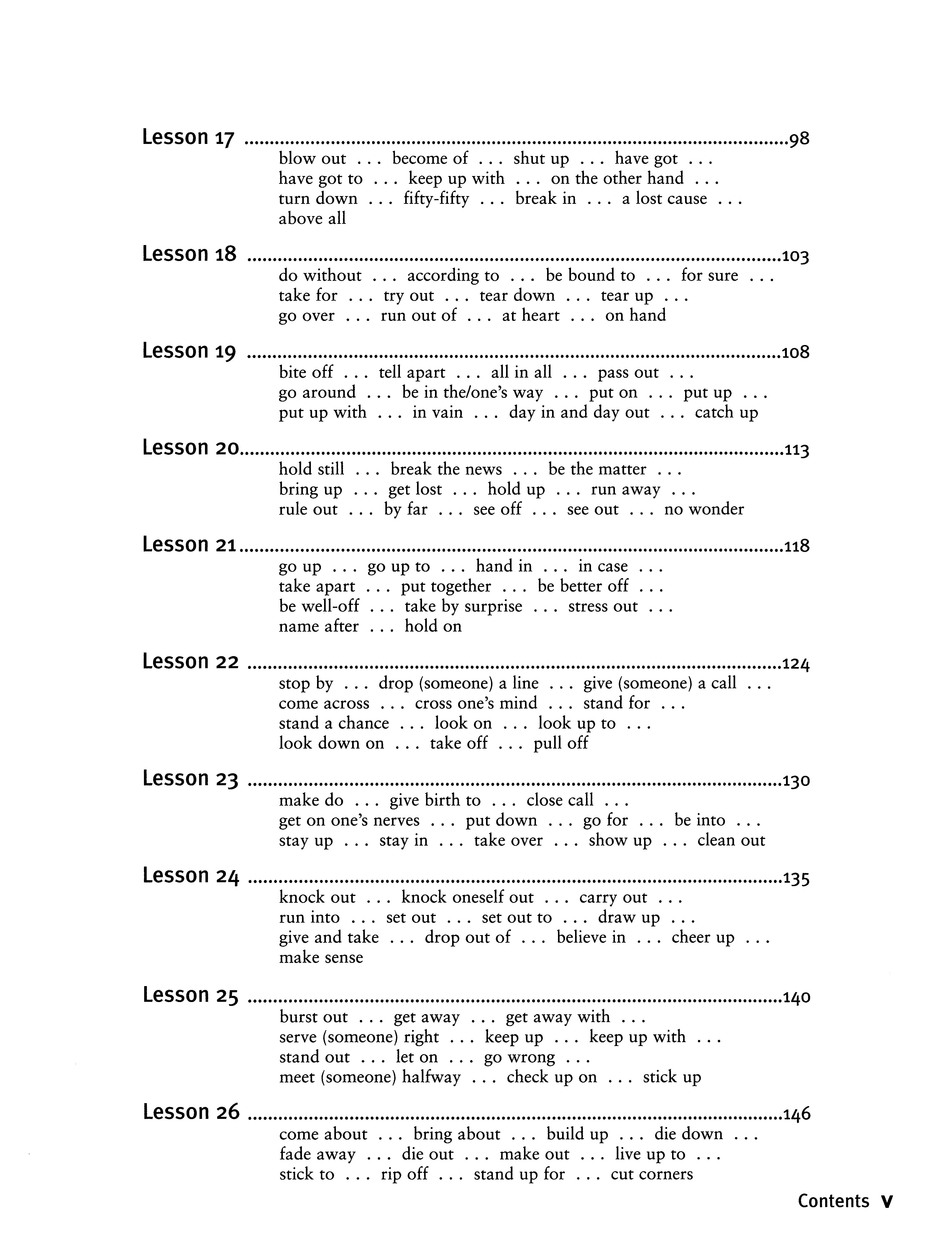 eat in I eat out . . . cut and dried look after feel like . . . once and for all hear from hear of make fun of come true . . . as a matter of fact have one's way look forward to