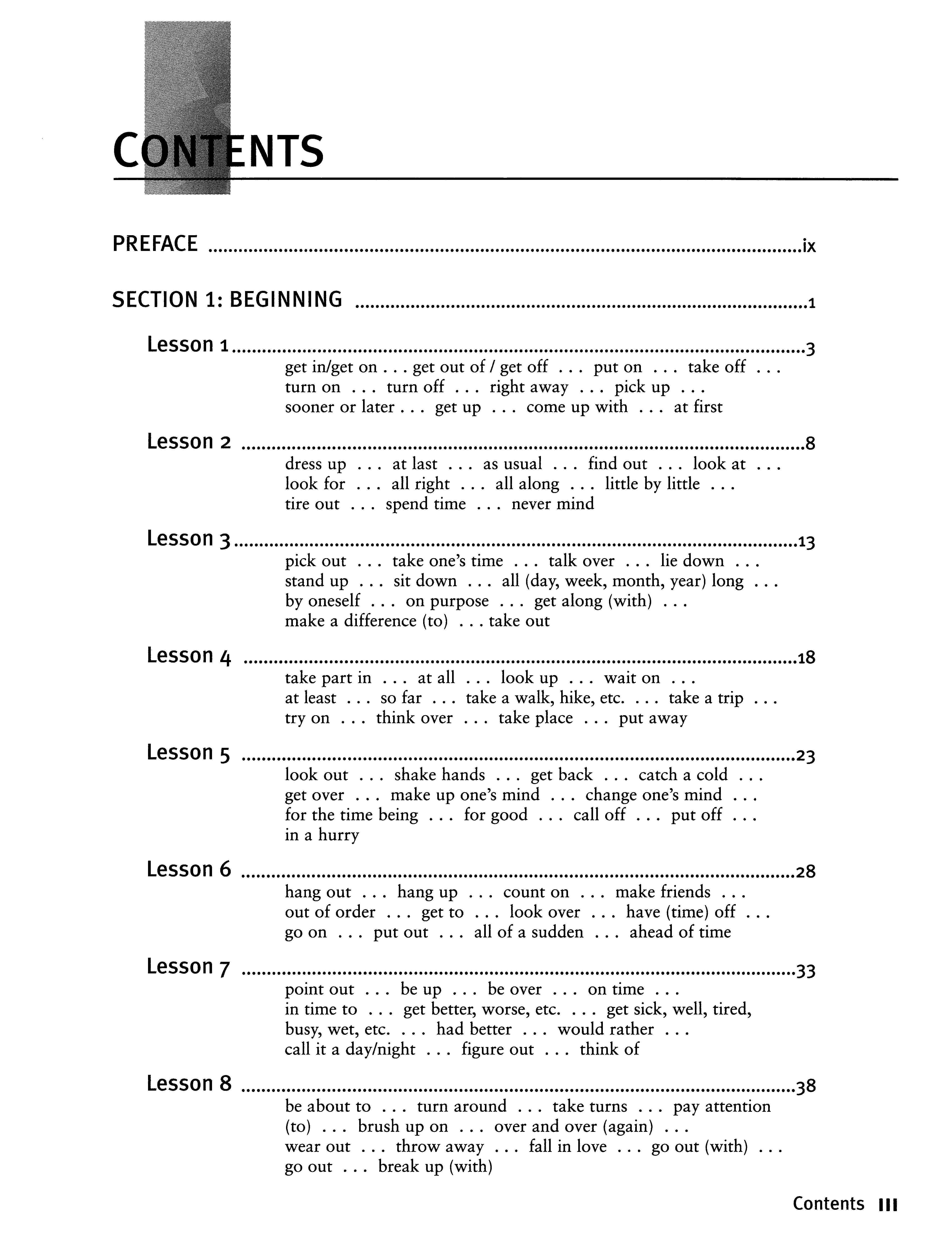 go through . go without saying put (someone) on .. . keep one's head lose one's head narrow-minded .. . stand up . get the better of break loose . on edge ... waste one's breath cut short Lesson 32 ..........................................................................................................