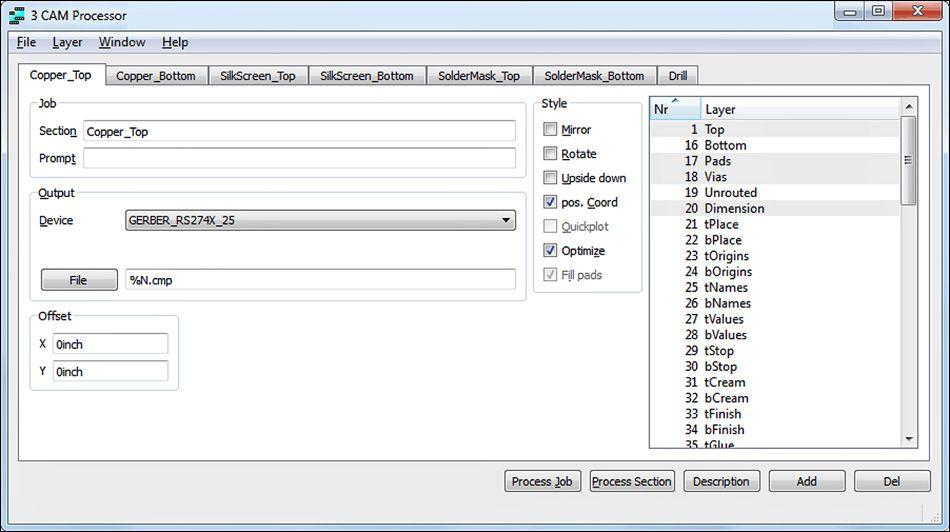 To fabricate a circuit board, most manufacturers require two types of files. To define a circuit’s geometry and connections, the accepted file format is RS-274X, also called the Gerber format. To specify drill diameters and drill locations, the accepted format is the Excellon format. The CAM Processor generates files of both types.