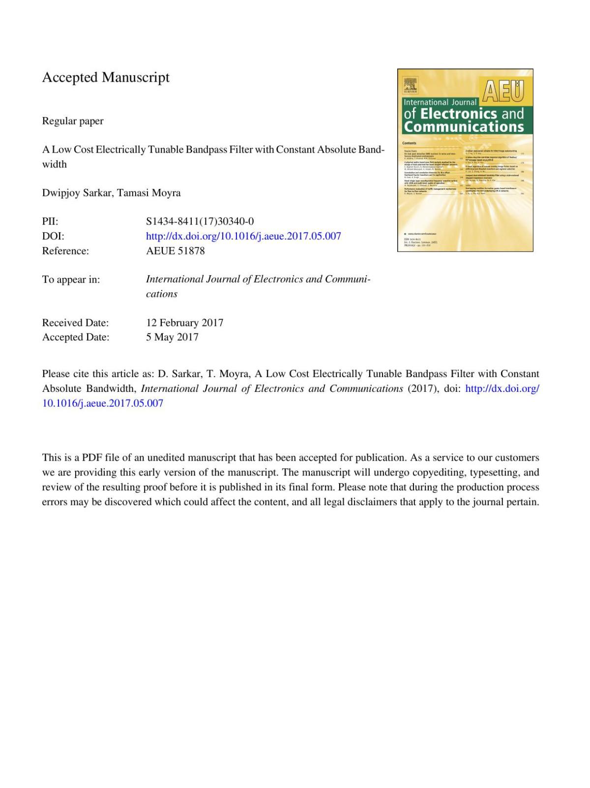 A Low Cost Electrically Tunable Bandpass Filter with Constant Absolute Bandwidth Dwipjoy Sarkar & Tamasi Moyra