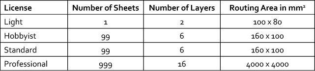 Looking at this table, you may wonder what the difference is between the Hobbyist and Standard licenses. The Hobbyist license is much, much less expensive but carries the requirement that EAGLE can be used only for noncommerical purposes. CadSoft requires a signed statement to this effect.