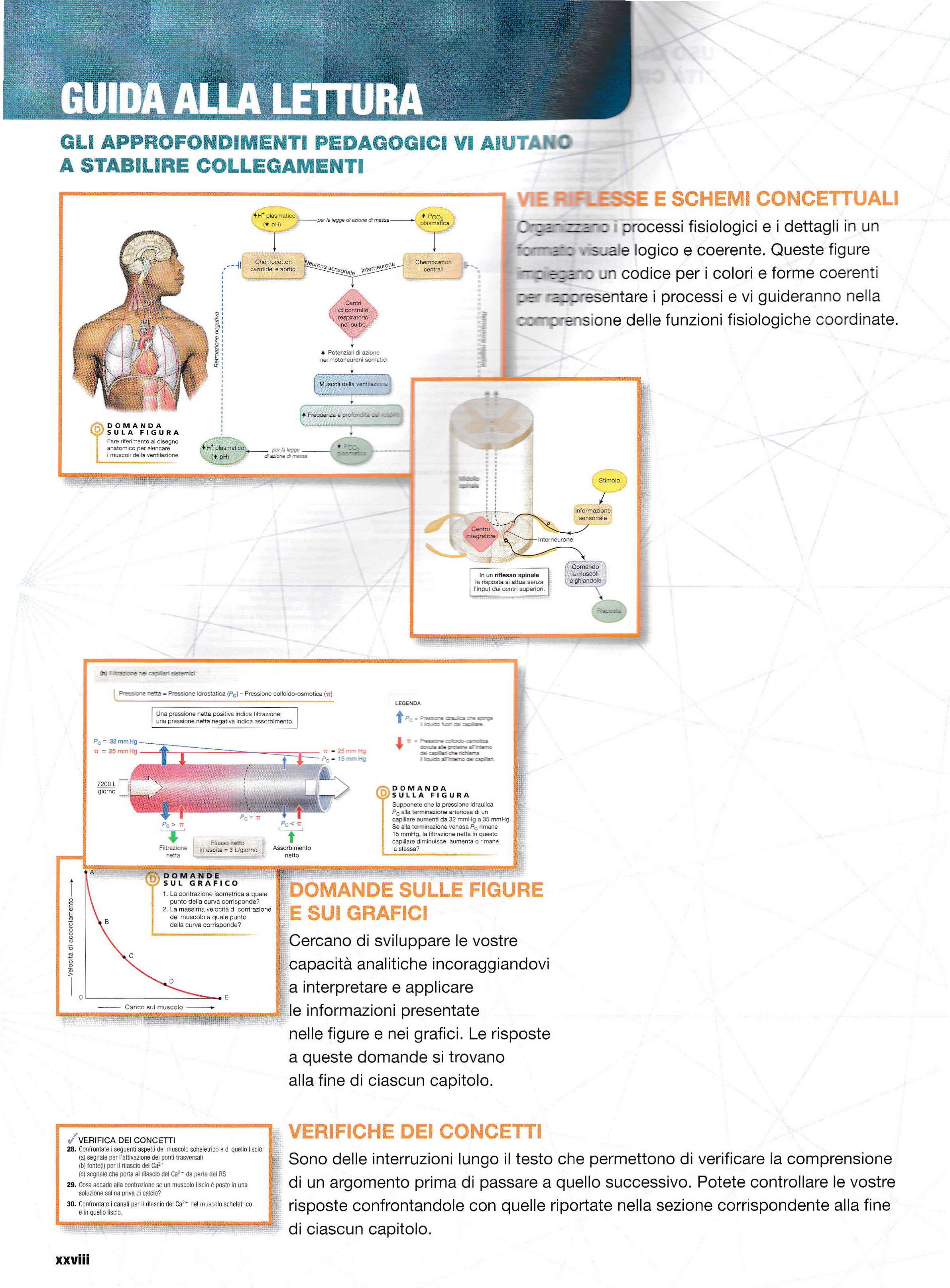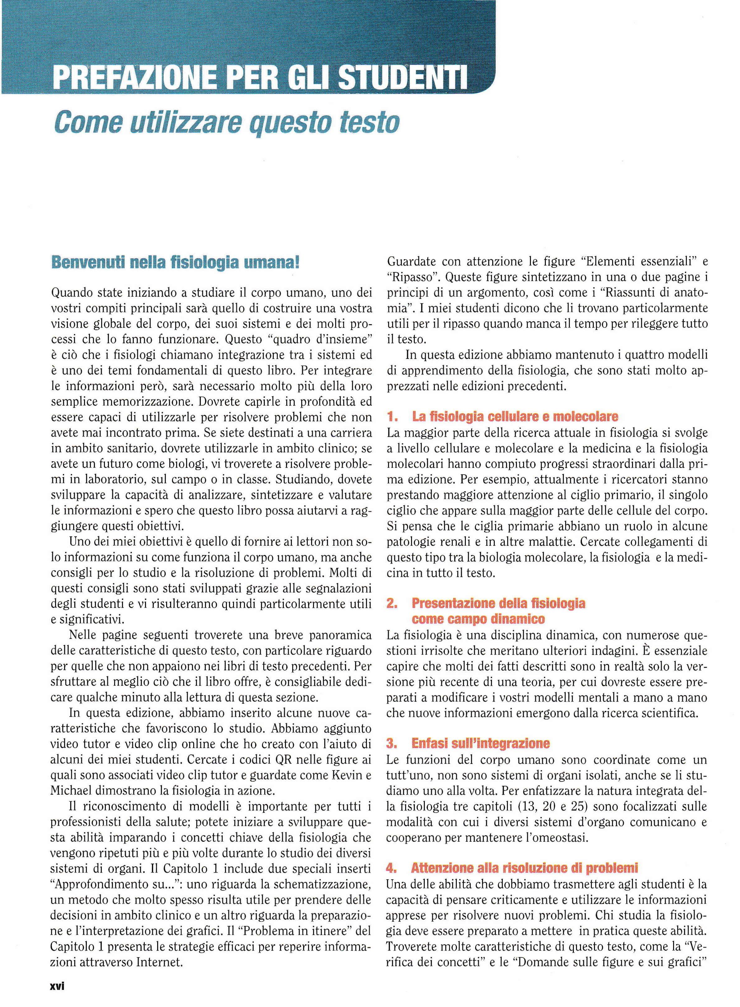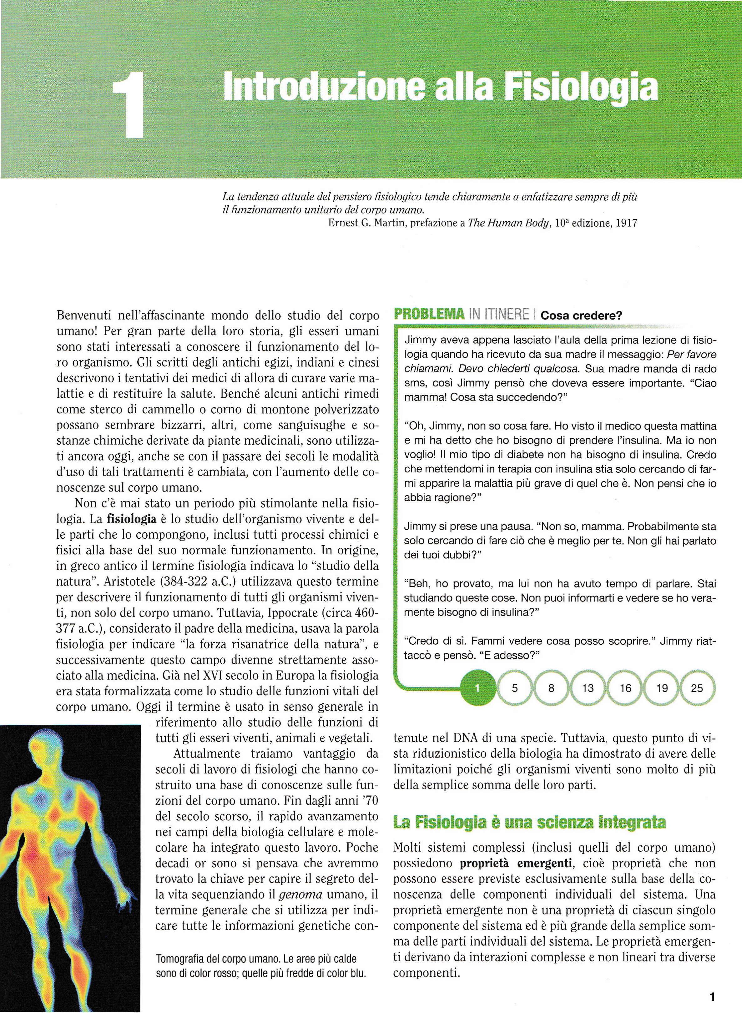 Non c'è mai stato un periodo più stimolante nella fisiolo§ia. La fisiologia è lo studio dell'organismo vivente e delle parti che lo compongono, inclusi tutti processi chimici e fisici alla base del suo normale funzionamento. In origine, in sreco antico il termine fisiologia indicava lo "studio della natura". Aristotele (384-322 a.C.) utilizzava questo termine per descrivere il funzionamento di tutti gli organismi viventi, non solo del corpo umano. Tuttavia, Ippocrate (circa 460377 a.C.), considerato il padre della medicina, usava la parola fisiologia per indicare "la forza risanatrice della natura", e successivamente questo campo divenne strettamente associato alla medicina. Già nel XVI secolo in Europa la fisiologia era stata formalizzata come lo studio delle funzioni vitali del corpo umano. Oggi il termine è usato in senso generale in riferimento allo studio delle funzioni di tutti gli esseri viventi, animali e vegetali. Attualmente traiamo vantaggio da secoli di lavoro di fisiolosi che hanno costruito una base di conoscenze sulle funzioni del corpo umano. Fin da§li anni '70 del secolo scorso, il rapido avanzamento nei campi della biologia cellulare e molecolare ha intesrato questo iavoro. Poche decadi or sono si pensava che avremmo trovato la chiave per capire il segreto della vita sequenziando il genoma umano, il termine gienerale che si utilizza per indicare tutte le informazioni genetiche con-