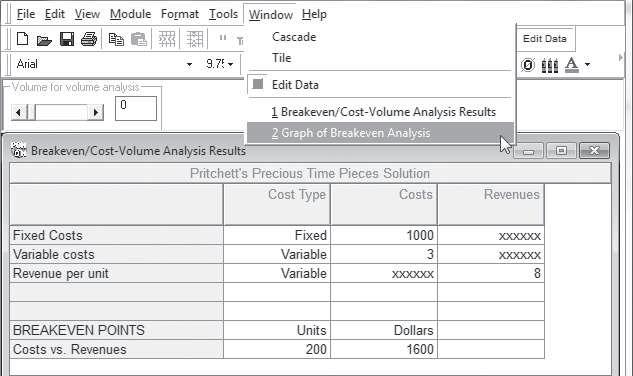 POM for Windows and QM for Windows were originally separate software packages for each type of course. These are now combined into one program called POM-QM for Windows. As seen in Program 1.1, it is possible to display all the modules, only the POM modules, or only the QM modules. The images shown in this textbook will typically display only the QM modules. Hence, in this book, reference will usually be made to QM for Windows. Appendix E at the end of the book provides more information about QM for Windows. To use QM for Windows to solve the break-even problem presented earlier, from the Module drop-down menu select Breakeven/Cost-Volume Analysis. Then select New-Breakeven Analysis to enter the problem. When the window opens, enter a name for the problem and select OK. Upon doing this, you will see the screen shown in Program 1.2A. The solution is shown in Program 1.2B. Notice the additional output available from the Window drop-down menu.