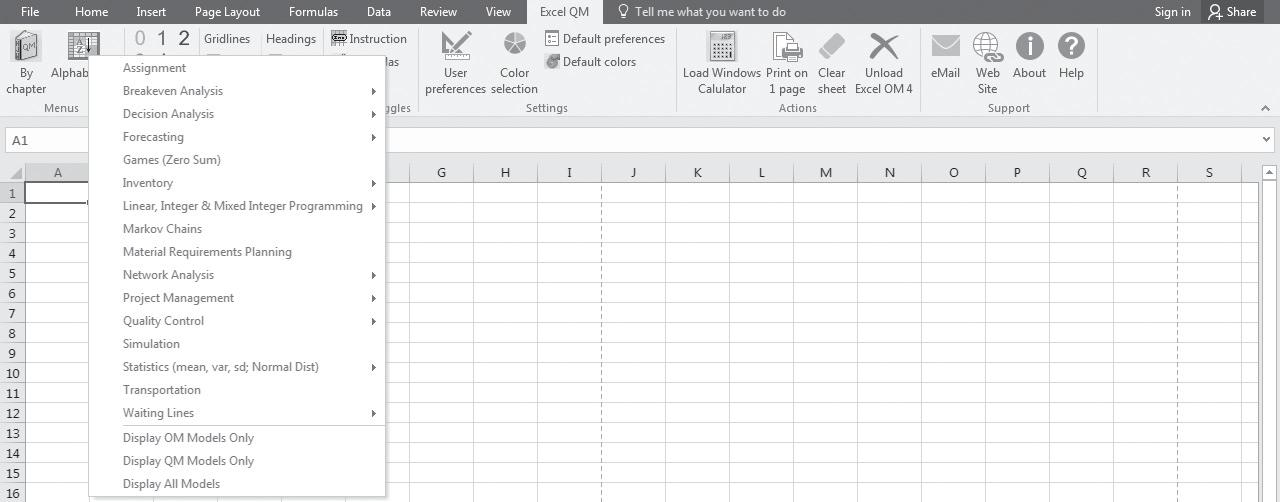 2. Excel QM, an add-in for Excel, can also be used to perform the mathematical calculations for the techniques discussed in each chapter. When installed in Excel 2016, Excel QM will appear as a tab on the ribbon. From this tab, the appropriate model can be selected from a menu, as shown in Program 1.3. Appendix F has more information about this. Excel files with the example problems shown can be downloaded from the Companion Website.