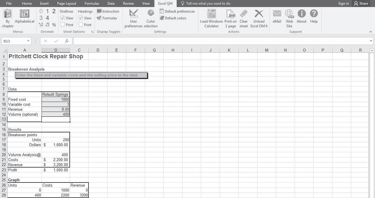 To use Excel QM in Excel 2016 to solve the break-even problem presented earlier, from the Alphabetical menu (see Program 1.3) select Breakeven Analysis. When this is done, a worksheet is prepared automatically, and the user simply inputs the fixed cost, variable cost, and revenue (selling price per unit), as shown in Program 1.4. The solution is calculated when all the inputs have been entered.