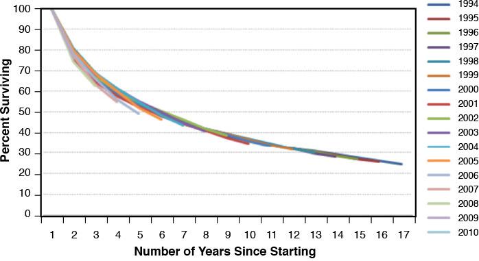 Figure 1.1 Survival rates of establishments, by year started and number of years since starting, 1994–2010