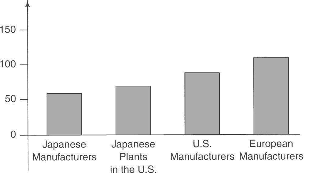 Another basis for comparison among automobile manufacturers is quality. Productivity gained at the expense of quality yields no competitive advantage. Figure 10 compares the major automobile-producing nations in terms of the average number of defects per 100 vehicles manufactured. The quality comparisons follow the same trends found in the earlier productivity comparisons. Japanese manufacturers average the fewest defects; European manufacturers average the most. American manufacturers find it difficult to compete in the global marketplace when their productivity and quality are