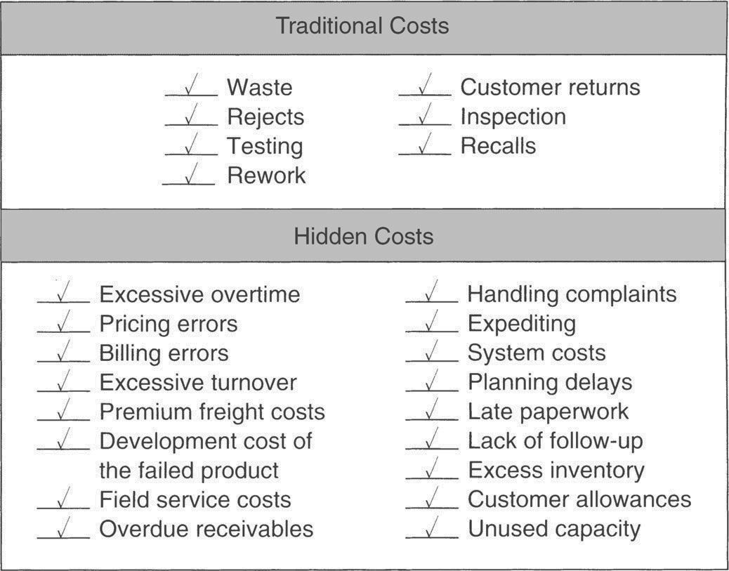 Figure 1 summarizes both the traditional and the hidden costs of poor quality. The key principle to understand when examining the hidden costs shown in Figure 1 is that if every activity in an organization is performed properly every time, these costs simply disappear.