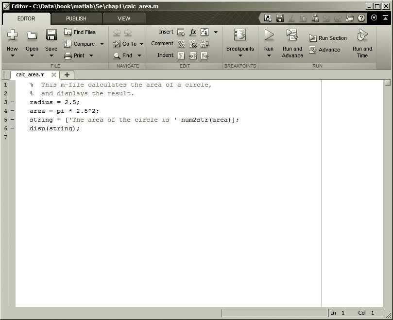 After an M- le is saved, it may be executed by typing its name in the Command Window. For the M- le in Figure 1.5, the results are: