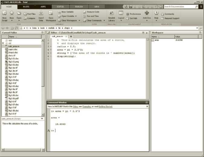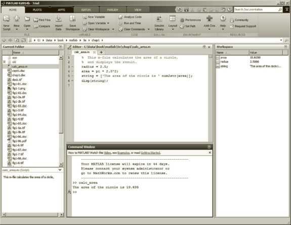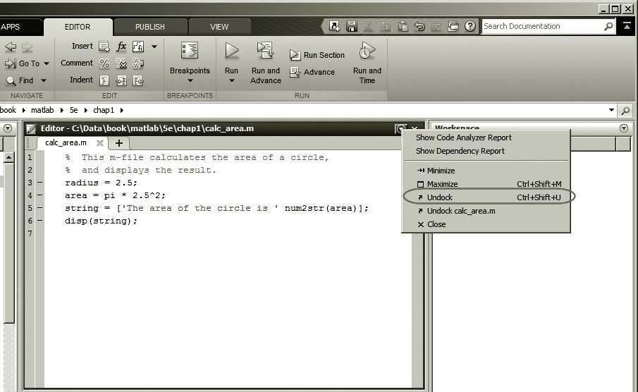 An Edit Window displaying a simple M- le called calc_area.m is shown in Figure 1.5. This le calculates the area of a circle given its radius and displays the result. By default, the Edit Window is docked to the desktop, as shown in Figure 1.5 c . The Edit Window can also be undocked from the MATLAB desktop. In that case, it appears within a container called the Documents Window, as shown in Figure 1.5 d . We will learn how to dock and undock a window later in this chapter.