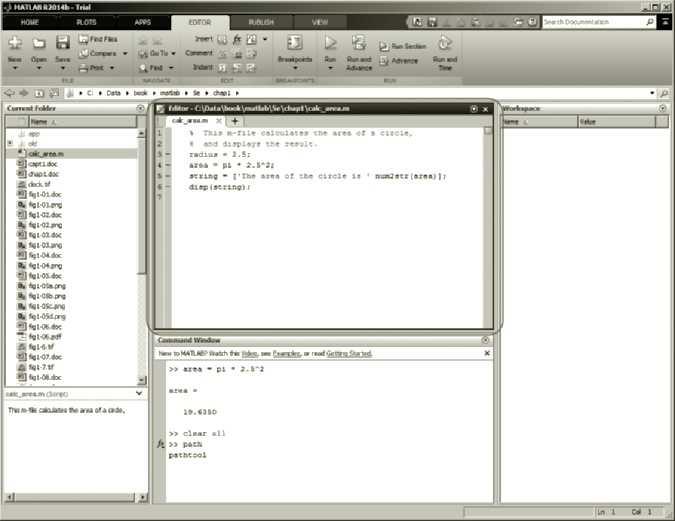 As an example of a simple interactive calculation, suppose that you want to calculate the area of a circle with a radius of 2.5 m. This can be done in the MATLAB Command Window by typing: