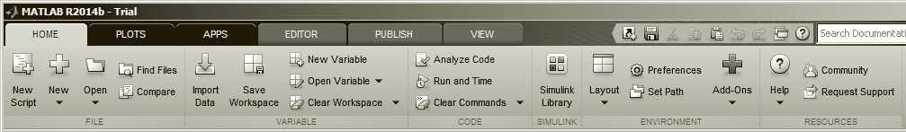 Figure 1.3 are Home, Plots, Apps, Editor, and so forth. When one of the tabs is selected, a series of controls grouped into sections is displayed. In the Home tab, the sections are File, Variable, Code, and so forth. With practice, the logical grouping of commands helps the user to quickly locate any desired function. In addition, the upper right-hand corner of the Toolstrip contains the Quick Access Toolbar, which is a place where the user can customize the interface and display the most commonly used commands and functions at all times. To customize the functions displayed there, right-click on the toolbar and select the Customize option from the popup menu.