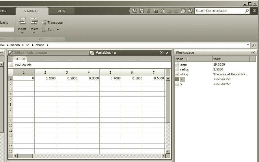 MATLAB calculates the answer as soon as the Enter key is pressed, and stores the answer in a variable (really a 1 3 1 array) called area. The contents of the variable are displayed in the Command Window as shown in Figure 1.2, and